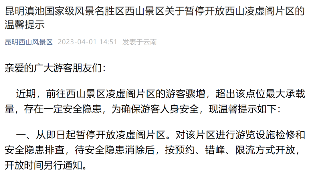 由于景区提升改造工作还在收尾,大量游客的到来,引发了安全隐患。西山景区在4月1日下午紧急发布温馨提示,暂停凌虚阁观景平台的开放,并于晚间在沿途进行劝返。