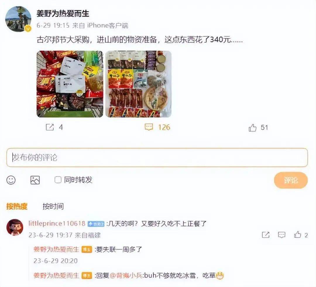另外,在6月29日晚上19时15分,姜野曾在个人微博“@姜野为热爱而生”上发布自己为进山准备的食物的图片,还和网友在评论区进行了互动。网友关心他“几天的啊? 又要好久吃不上正餐了”,姜野回复“要失联一周多了”。