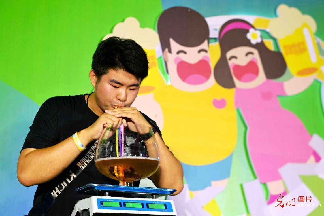 2023年7月16日,山东青岛金沙滩啤酒城,一名选手在参加酒王擂台赛。(俞方平摄/光明图片)