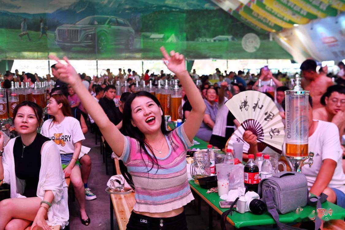 2023年7月16日,山东青岛金沙滩啤酒城,游客在啤酒大棚内饮酒狂欢。(俞方平摄/光明图片)