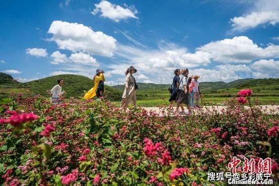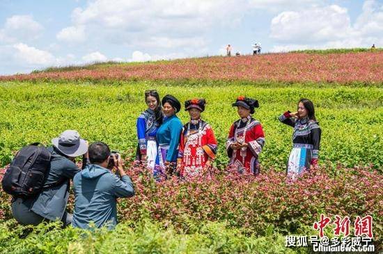 游客在贵州威宁自治县板底乡雄鹰村的荞麦花海里合影。罗大富 摄