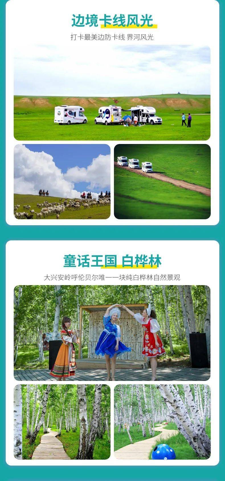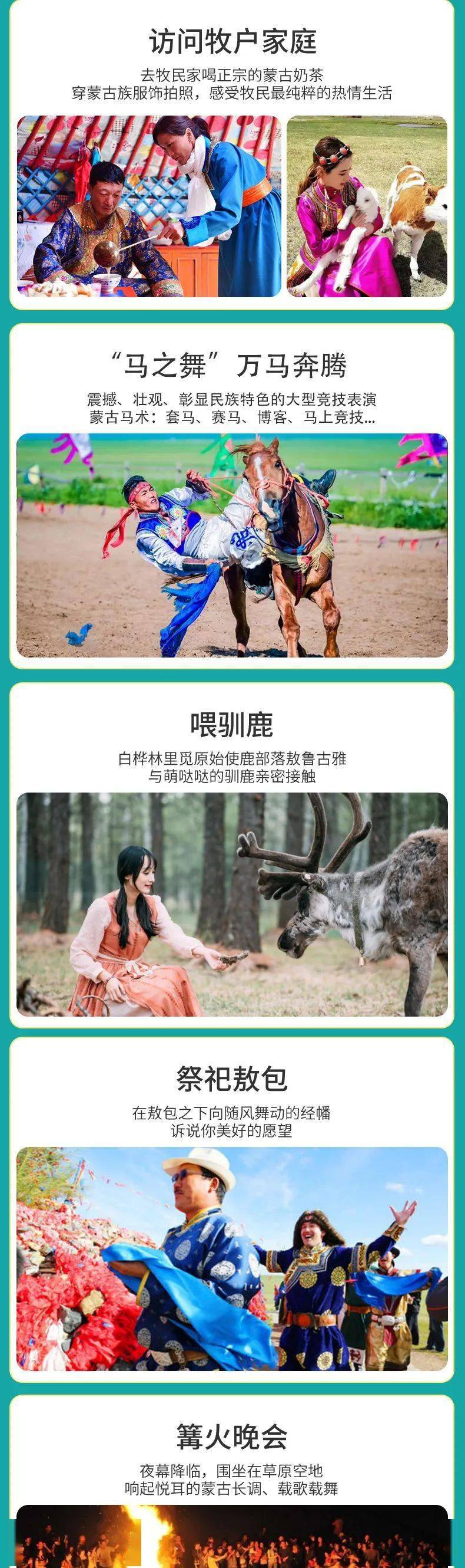 三、全程门票:白桦林景区门票+景交车、私家牧场门票、彩带河门票、呼伦湖门票、国门景区门票、马之舞
