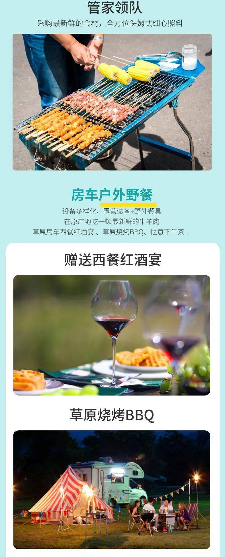 中午我们抵达【房车营地】组装好我们的露营帐篷,拿出我们早上购买的食材,草原上的野炊开始啦!房车管家将为我们烹制草原上独有的【西餐红酒宴】在蓝天白云下,吃着牛排,品着红酒,享受草原带给我们的惬意生活。