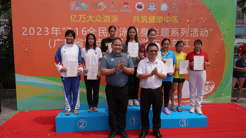 活动上,东莞市道滘镇党委书记曾平治、东莞市文化广电旅游体育局副局长吴劭文、东莞市文化广电旅游体育局群体科科长李敬东、东莞市游泳运动管理中心主任李泽、广东省游泳协会常务副秘书长陈杰龙、广东省游泳协会副秘书长谢斌共同推杆,宣布2023 年“7.16 全民游泳健身主题系列活动”(广东省重点会场)畅游东莞东江活动正式启动。