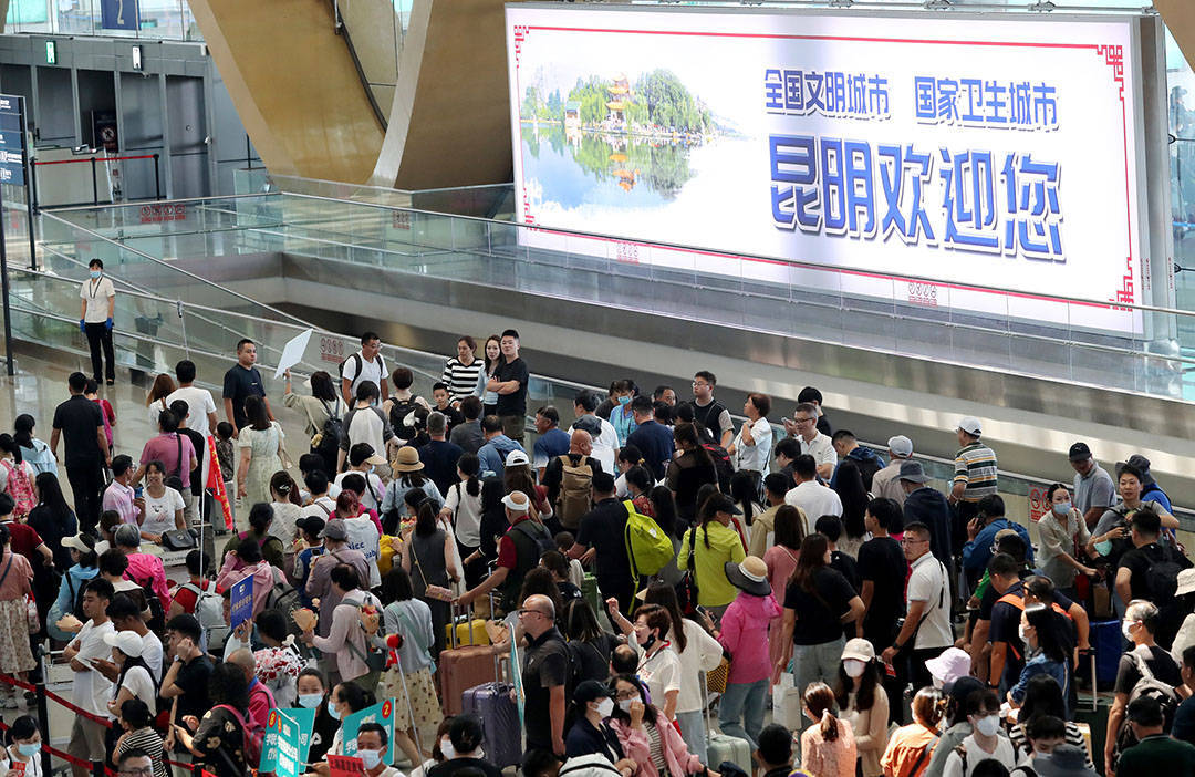 2023年7月16日,昆明长水国际机场到达大厅客流涌动,大批旅游团队客流抵昆开启彩云之南的旅程。本文图片均为视觉中国 图