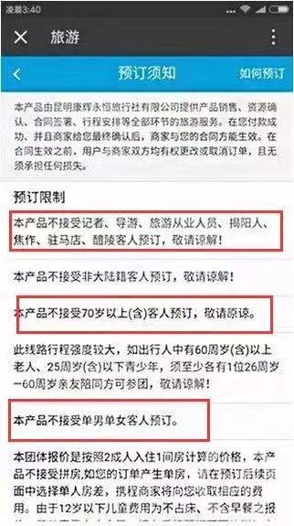 ▲2017年,某平台上部分云南游产品,对游客的职业及地域进行了限制。图片来源/网络