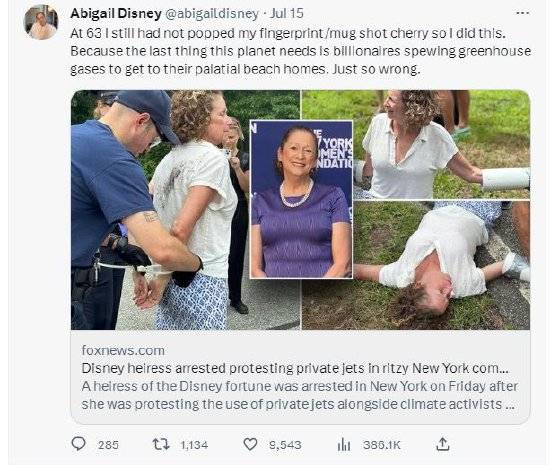 据当地报纸报道,阿比盖尔·迪士尼于上周五被捕,原因是她与几个组织的成员一起参加示威活动,封锁了东汉普顿机场,以阻止那里的私人飞机离开。