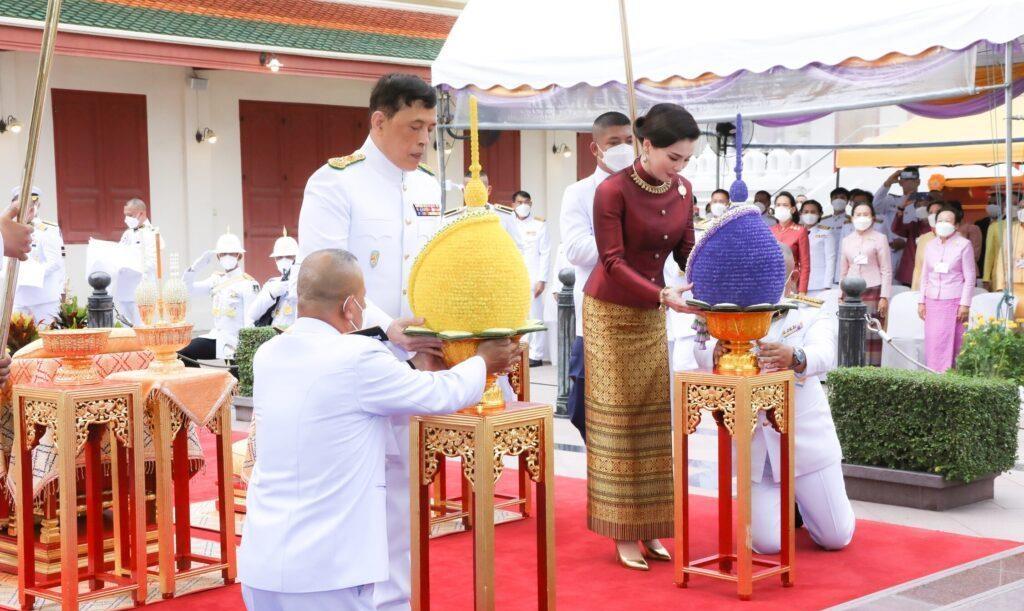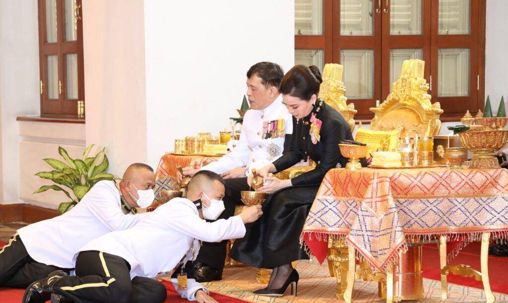 工作人员跪在泰国国王和王后苏提达身旁,苏提达踩着高跟鞋展现了王后应有的尊严。当然,苏提达现在很得意,泰国国王为她分散了一个后宫。泰国国王哇集拉隆功是公认的花花公子,历任妻子的命运都不太好。到目前为止,苏提达是最幸福的。
