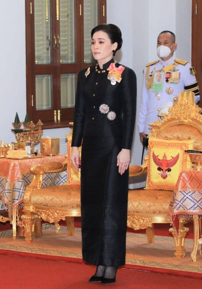 苏提达王后现在喜欢一些夸张的珠宝。这次她身着黑色传统泰国服饰亮相。她还特意搭配了黑色丝袜和十厘米黑色高跟鞋。她又从头到脚变美了!