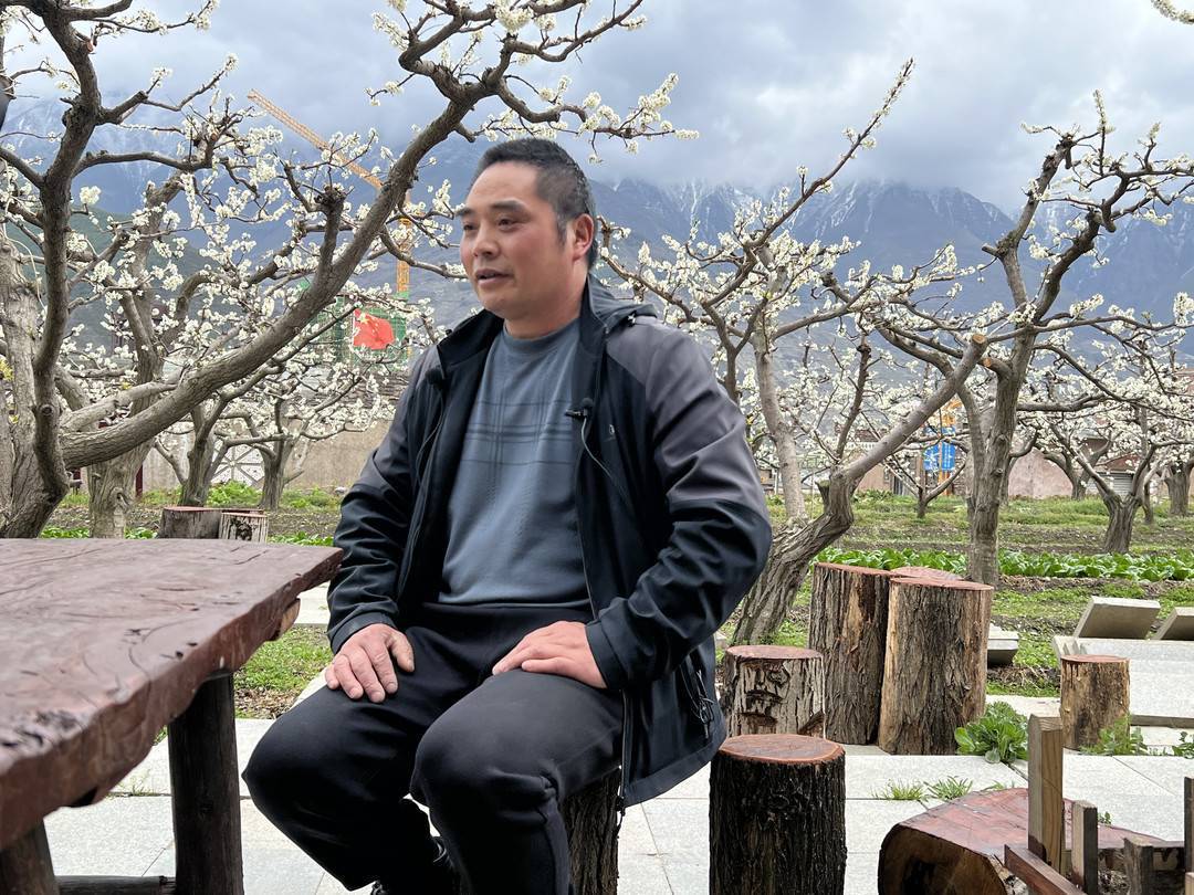 坪头村村民蹇志德的房子,是特色的羌族建筑,门口是一片李子树,房屋正对面就是雪山,环境非常优美,他在自家的院子里办起民宿,他说,“去年家里靠经营民宿收入不错。”