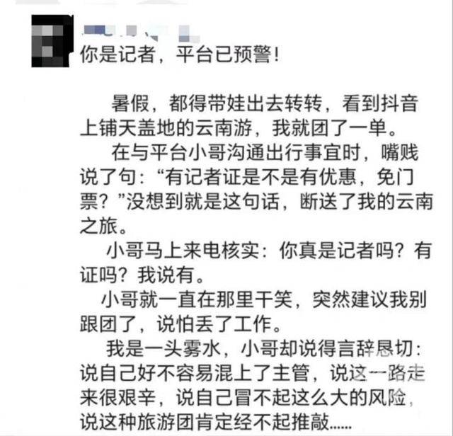 按照这位同行的说法,他原本是在线上和工作人员沟通,多问了一句,记者证是不是有优惠。结果对方直接打电话过来,确认他是记者后,就建议不要跟团,因为这种旅游团经不起推敲,他冒不起这么大的风险。