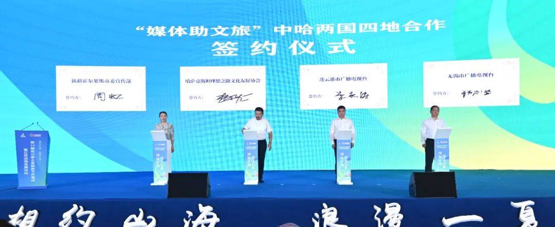 哈萨克斯坦阿斯塔纳“理想之路”文化友好协会、霍尔果斯市委宣传部、无锡市广播电视台、连云港市广播电视台代表达成“媒体助文旅”中哈两国四地合作并签约。