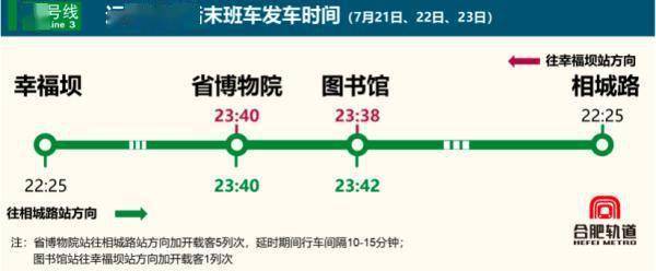 3号线始发站末班车时间不变,原末班车发出后,从省博物院站往相城路站方向加开载客5列次,省博物院站末班车发车时间由22:38延时至23:40,延长时段内,行车间隔为10-15分钟。