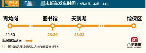 4号线始发站末班车时间不变,原末班车发出后,从图书馆站往综保区站方向加开载客1列次,图书馆站发车时间为23:20。