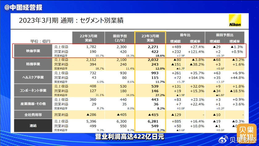 相机行业也在消费电子低迷的趋势下独树一帜。根据尼康公司发布的截至2023年3月的全财年财报,其影像业务销售收入达2271亿日元(约人民币117.8亿元),同比增长高达27.4%;营业利润高达422亿日元(约人民币21.9亿元),同比涨幅高达121.4%。