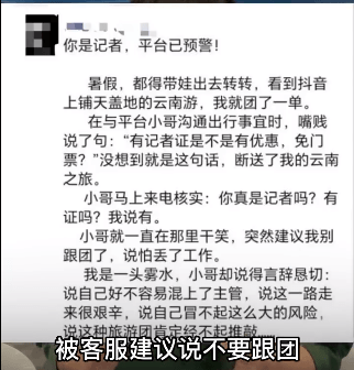 据媒体报道,近日,一位新闻从业者在朋友圈爆料,自己在网上团购预订一家云南旅行社时,因为持有记者证被客服建议不要跟团。