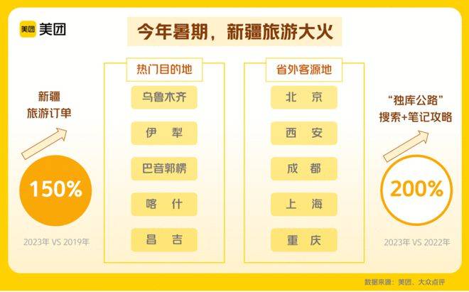 美团、大众点评数据显示,自6月18日恢复通车以来,“独库公路”的相关搜索、攻略笔记同比去年增长约200%,新疆的旅游订单(含酒店民宿、景点门票、交通等)较2019年同期增长超过150%,热门目的地包含乌鲁木齐、伊犁、巴音郭楞、喀什、昌吉等,省外游客主要来自北京、西安、成都、上海、重庆等地。