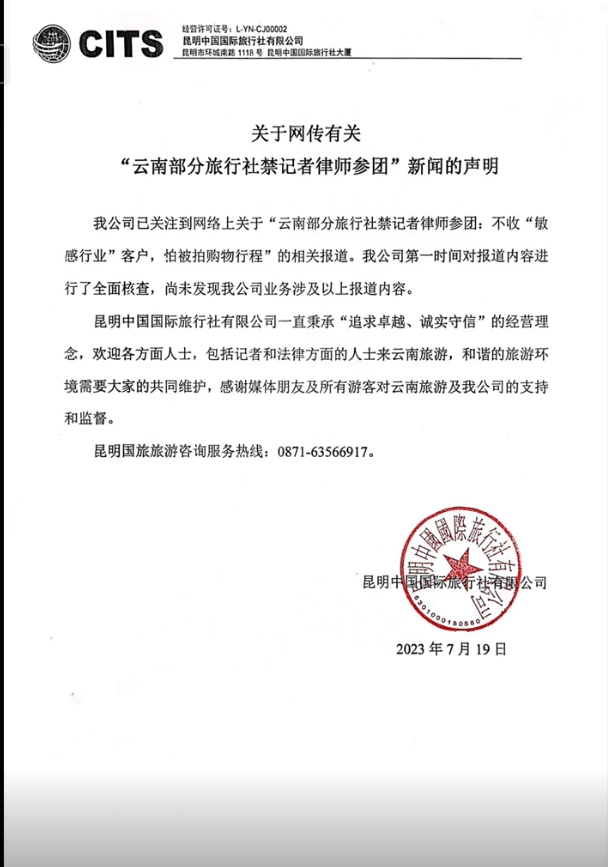 7月19日,牵涉进相关媒体报道的昆明中国国际旅行社有限公司于抖音发布声明称,已关注到网络上关于“云南部分旅行社禁记者律师参团:不收‘敏感行业’客户,怕被拍购物行程”的相关报道,并表示“我公司第一时间对报道内容进行了全面核查,尚未发现我公司业务涉及以上报道内容。”