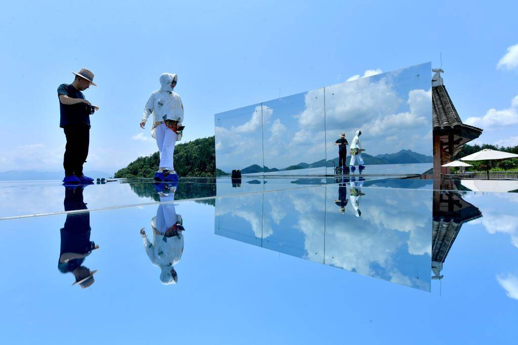 6月25日,游客在宣恩县锣圈岩村一处乡村民宿的“天空之镜”景点游玩。新华社发(宋文摄)