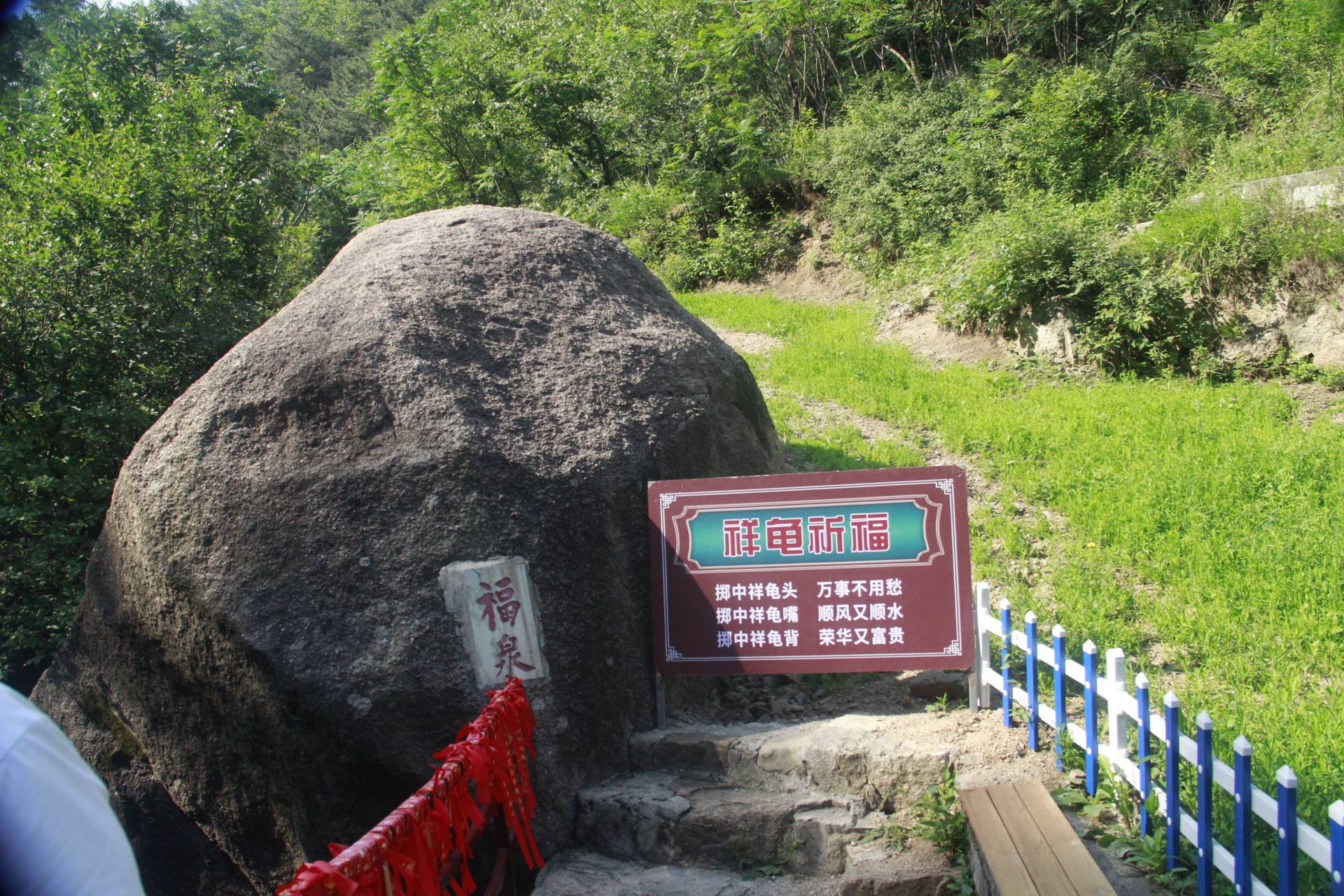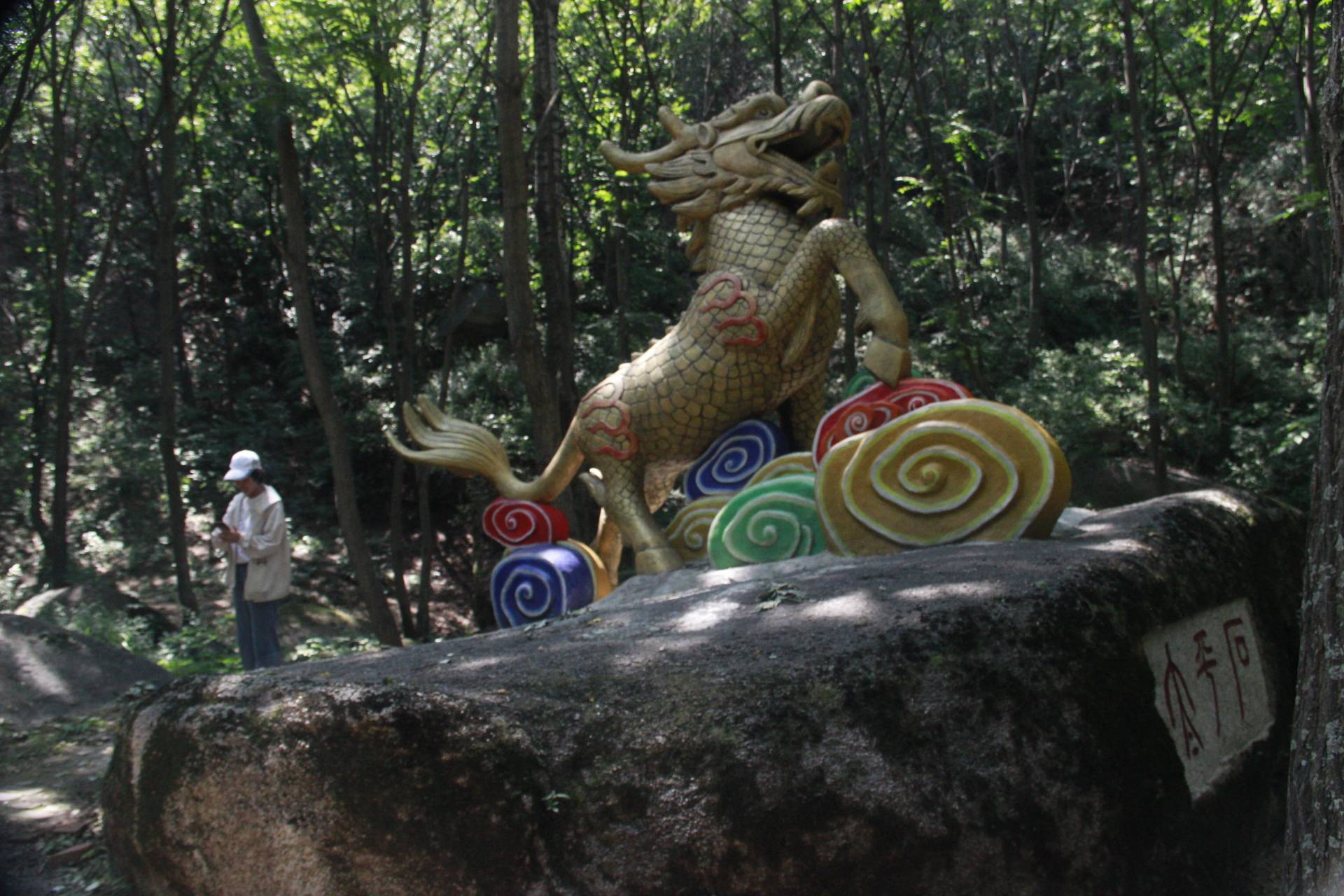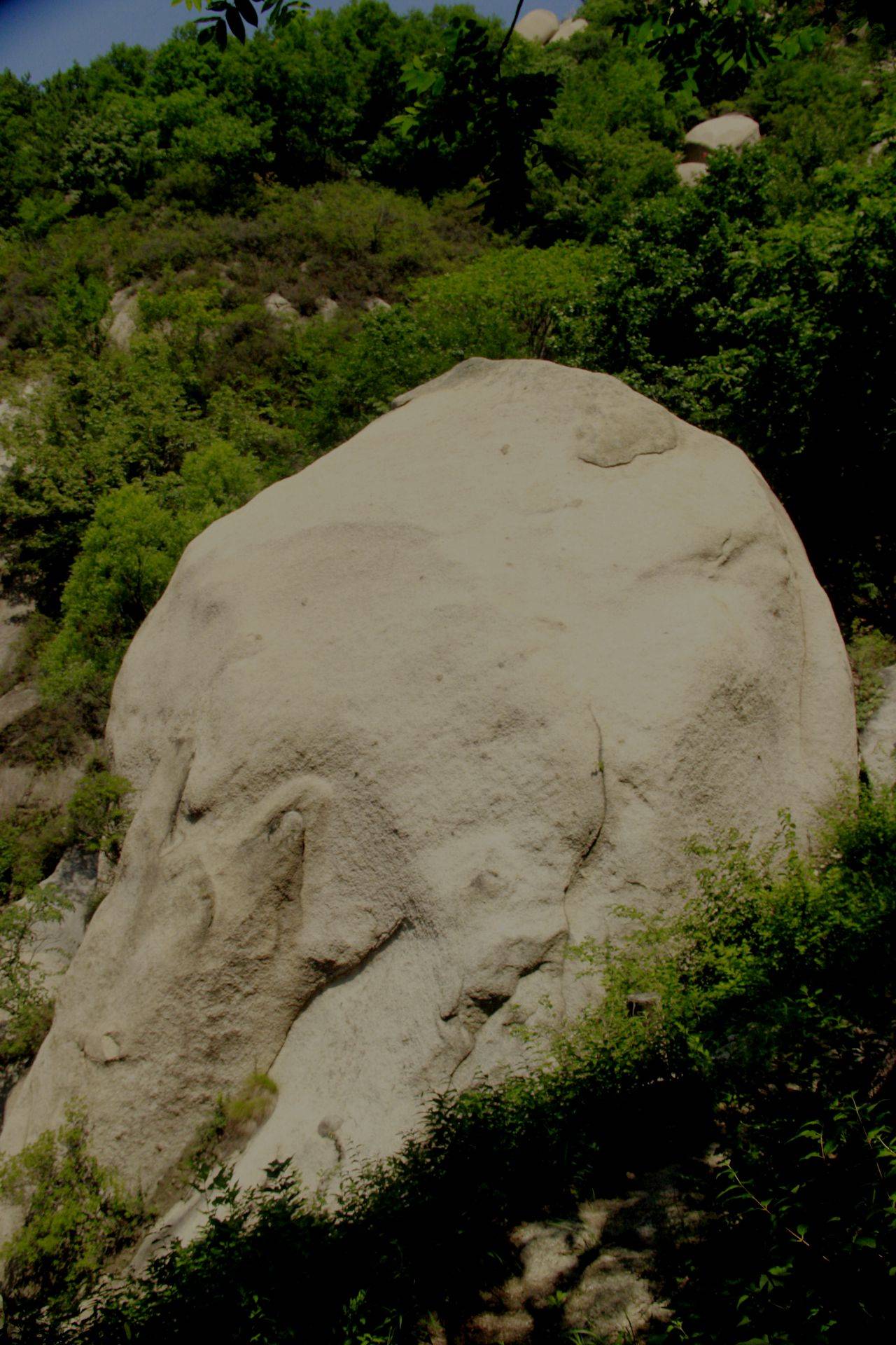 下到沟壑底部,我们稍事休息。那块太平石 上新修了一个麒麟,预示太平世界的美好祝福。过去这上面是我们野餐的餐桌。