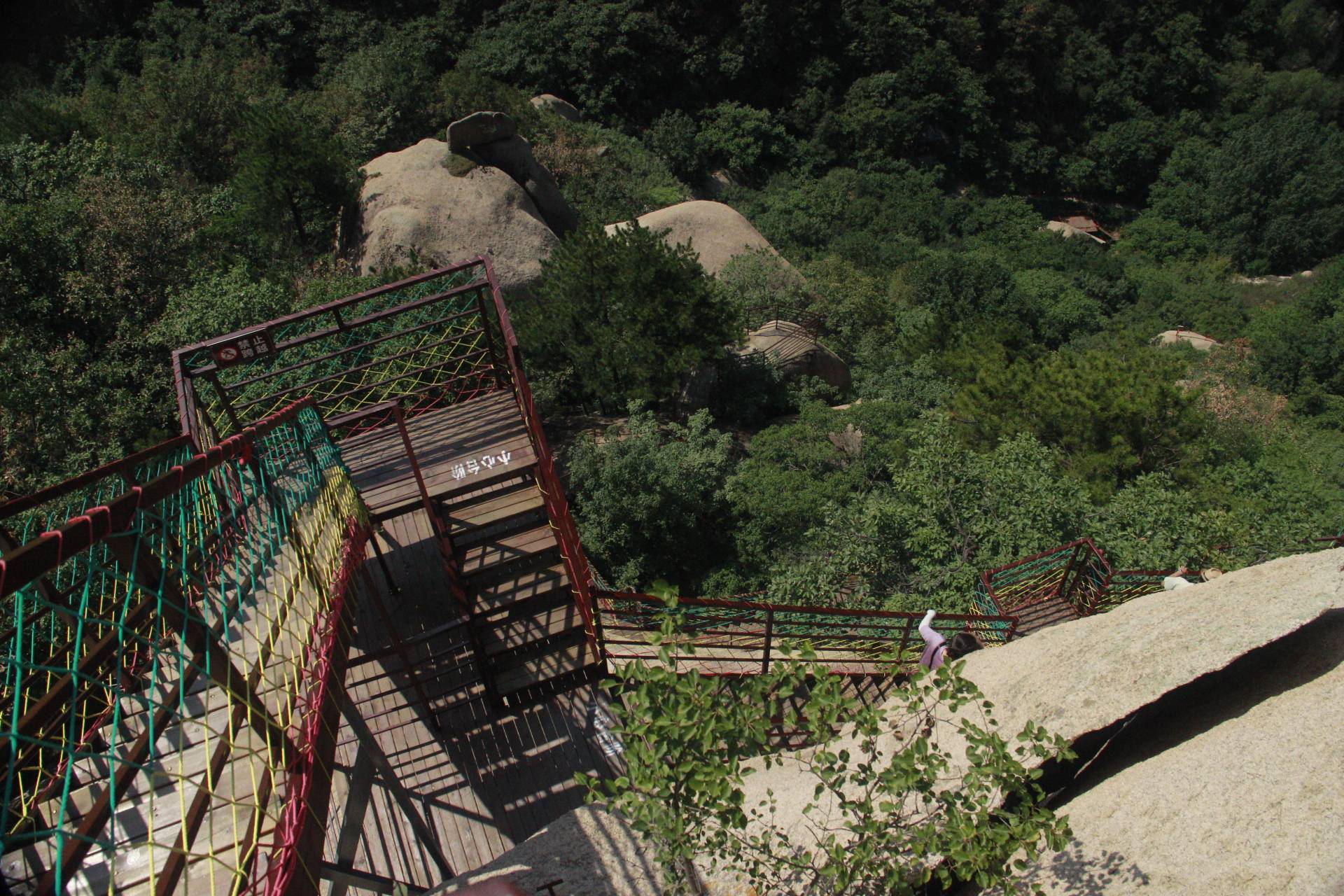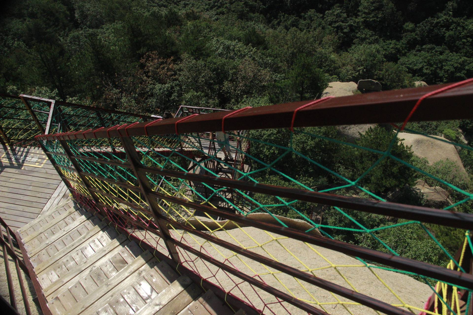 经过层层历险,钻石缝,过栈桥,我们来到海拔950米高的状元亭。稍事休息后,回头走过一座大约百米的吊桥,不时传来阵阵惊叫声。桥身晃动,下面是深渊。
