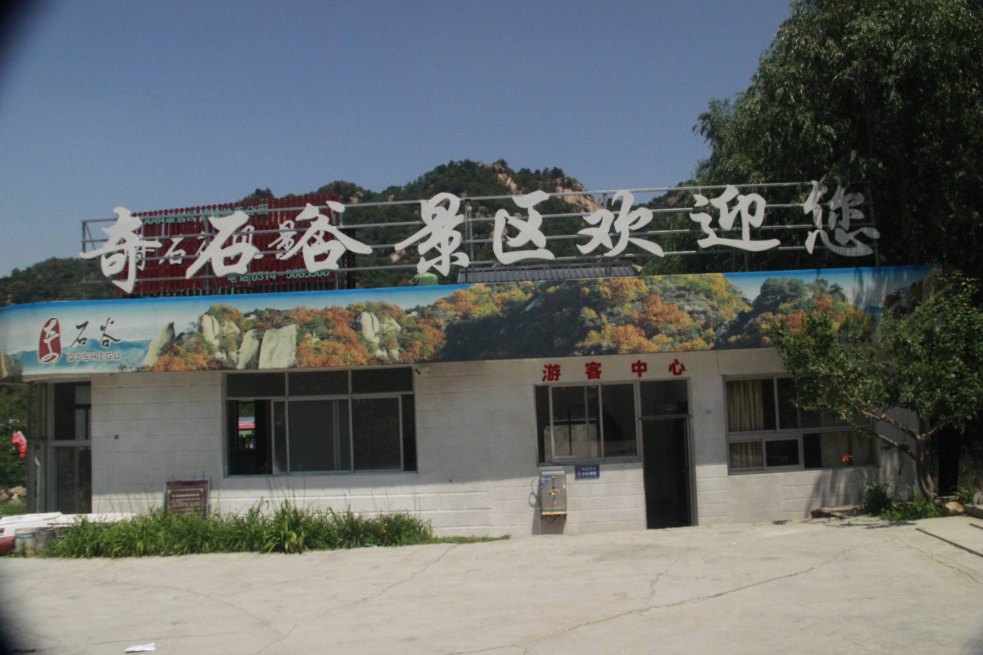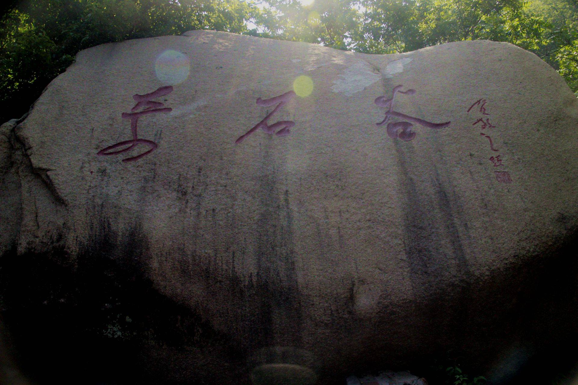 一块几丈高的巨石矗立,上面有当代著名诗人、剧作家贺敬之老先生题“奇石谷”三个大字,据说这三个字是贺老先生题写第41次定稿,可见老先生严谨的艺术态度和治学精神。