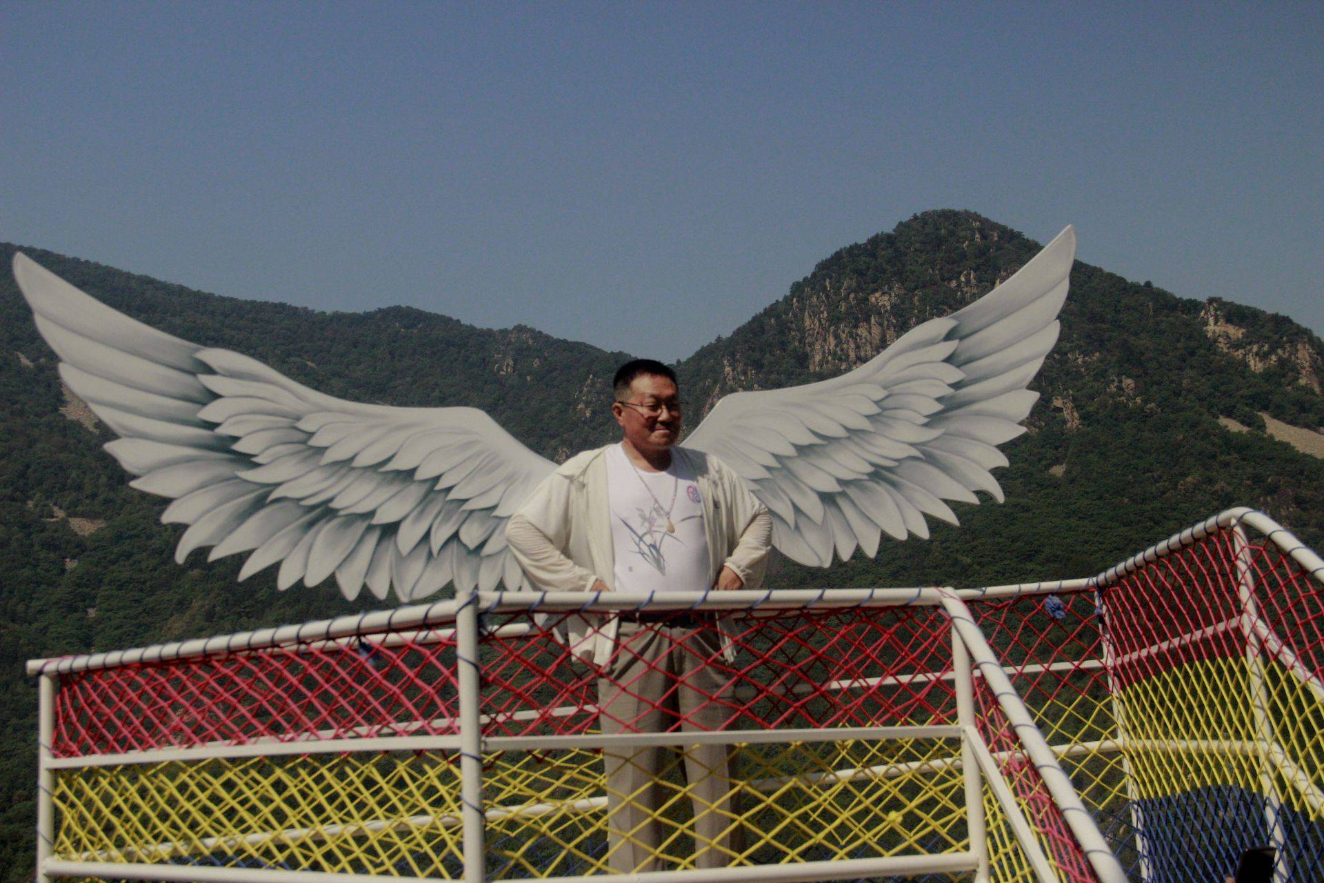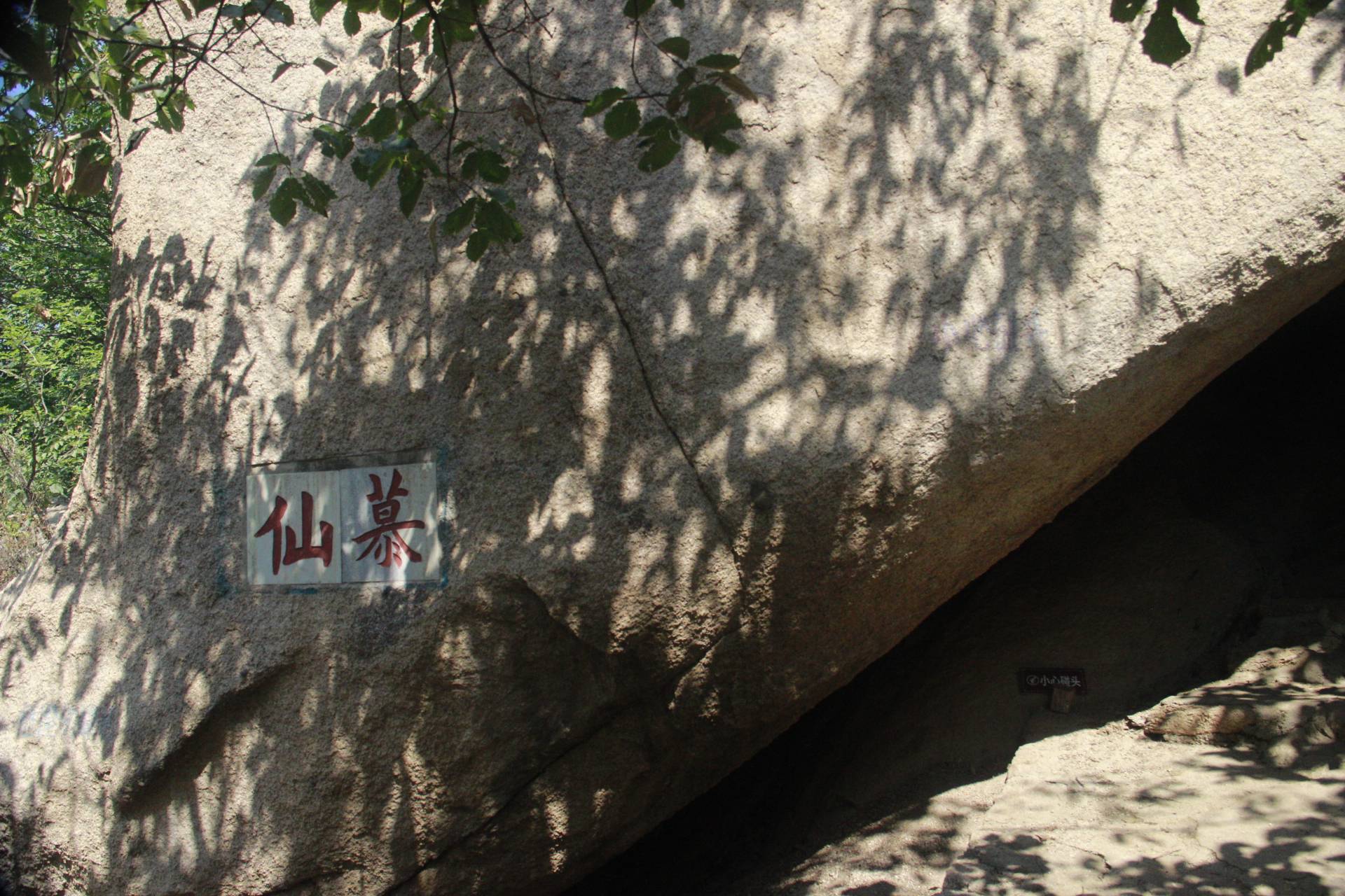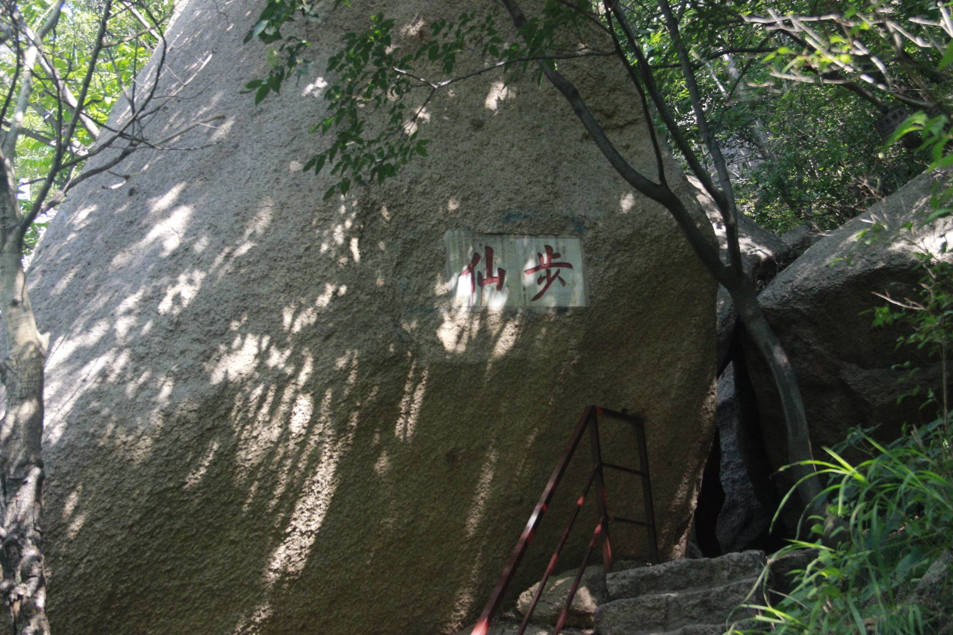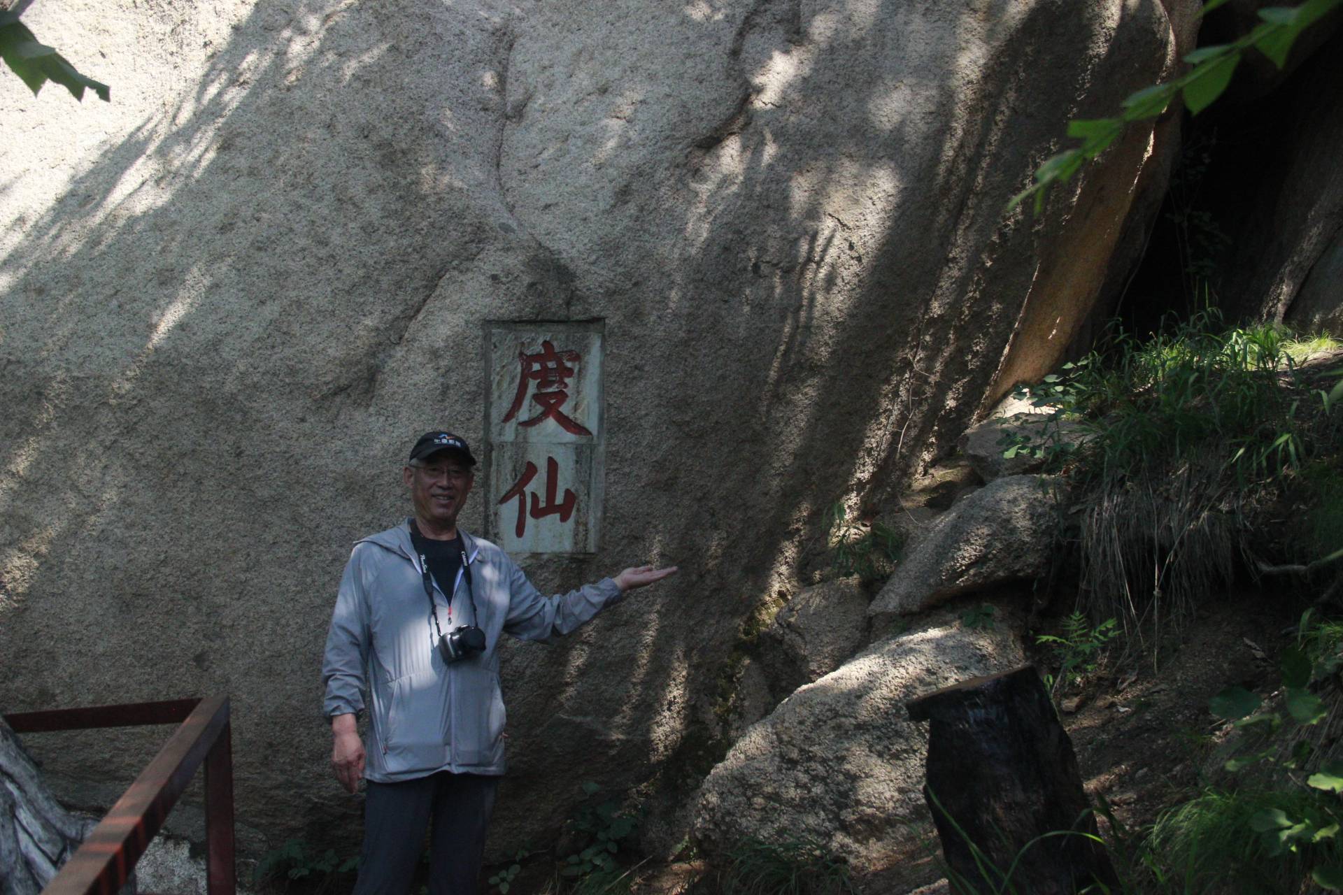 我们从“如意池”旁沿着铺就的石阶艰难北上,攀登北峰。沿途钻过步仙、慕仙、梦仙、会仙、度仙等层层“仙洞”,我们大汗淋漓,真的要度化成仙人了。在接近顶峰的地方,设计者在巨石上,设计了一对飞天翅膀,迎合了游客飞天成仙的梦想。游客争相拍照。
