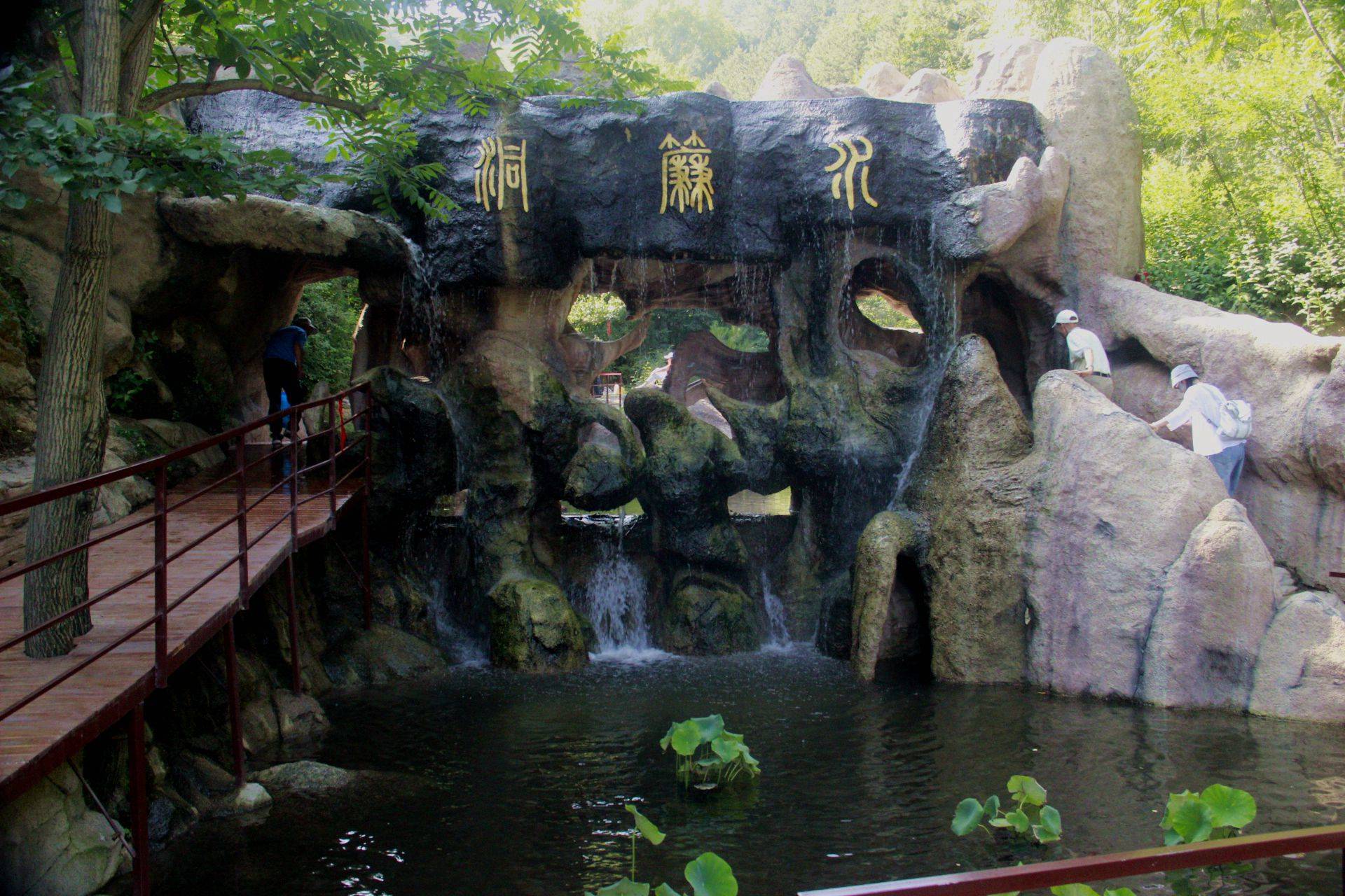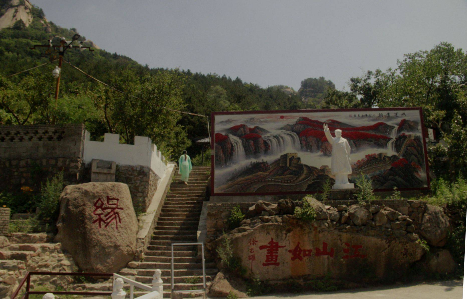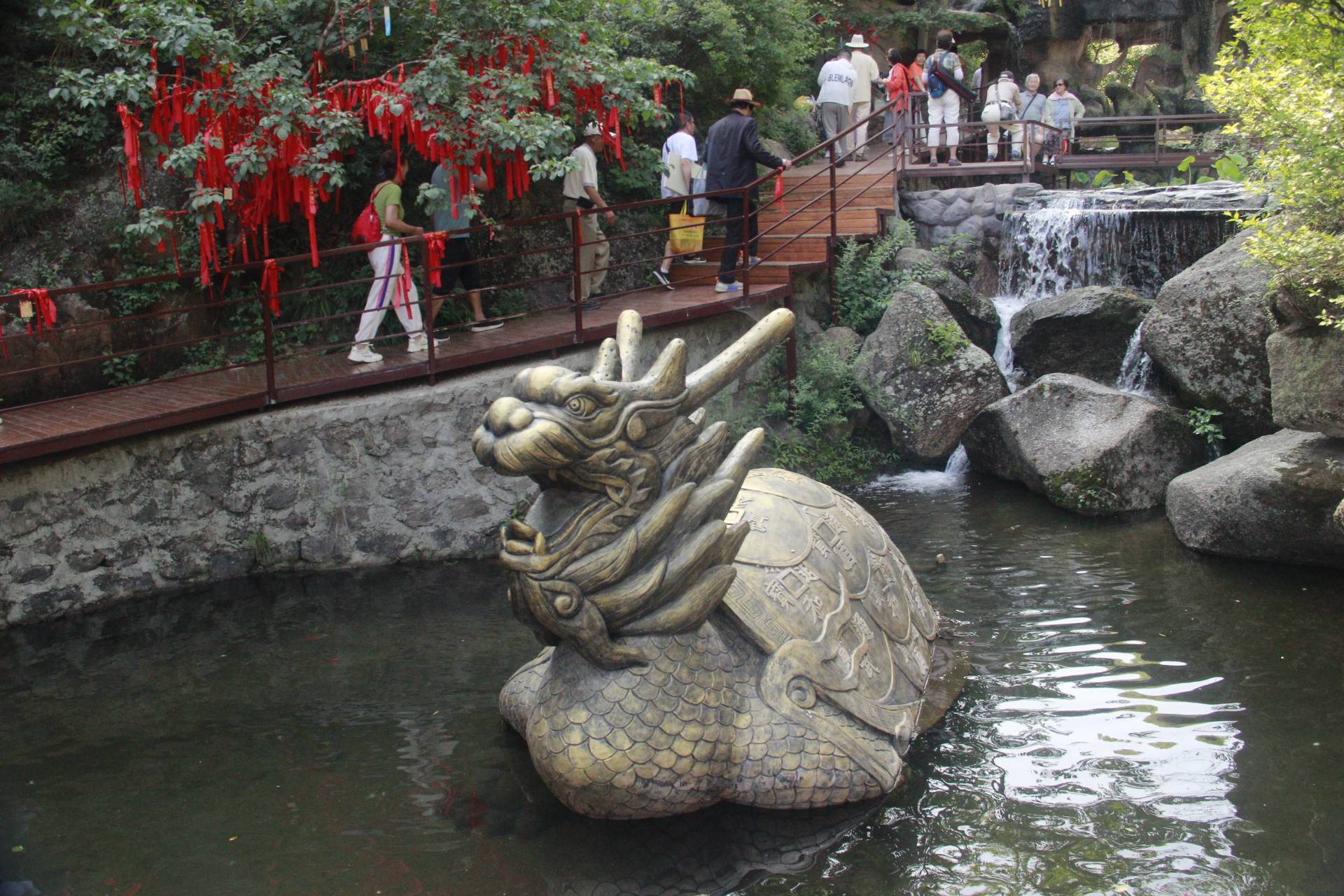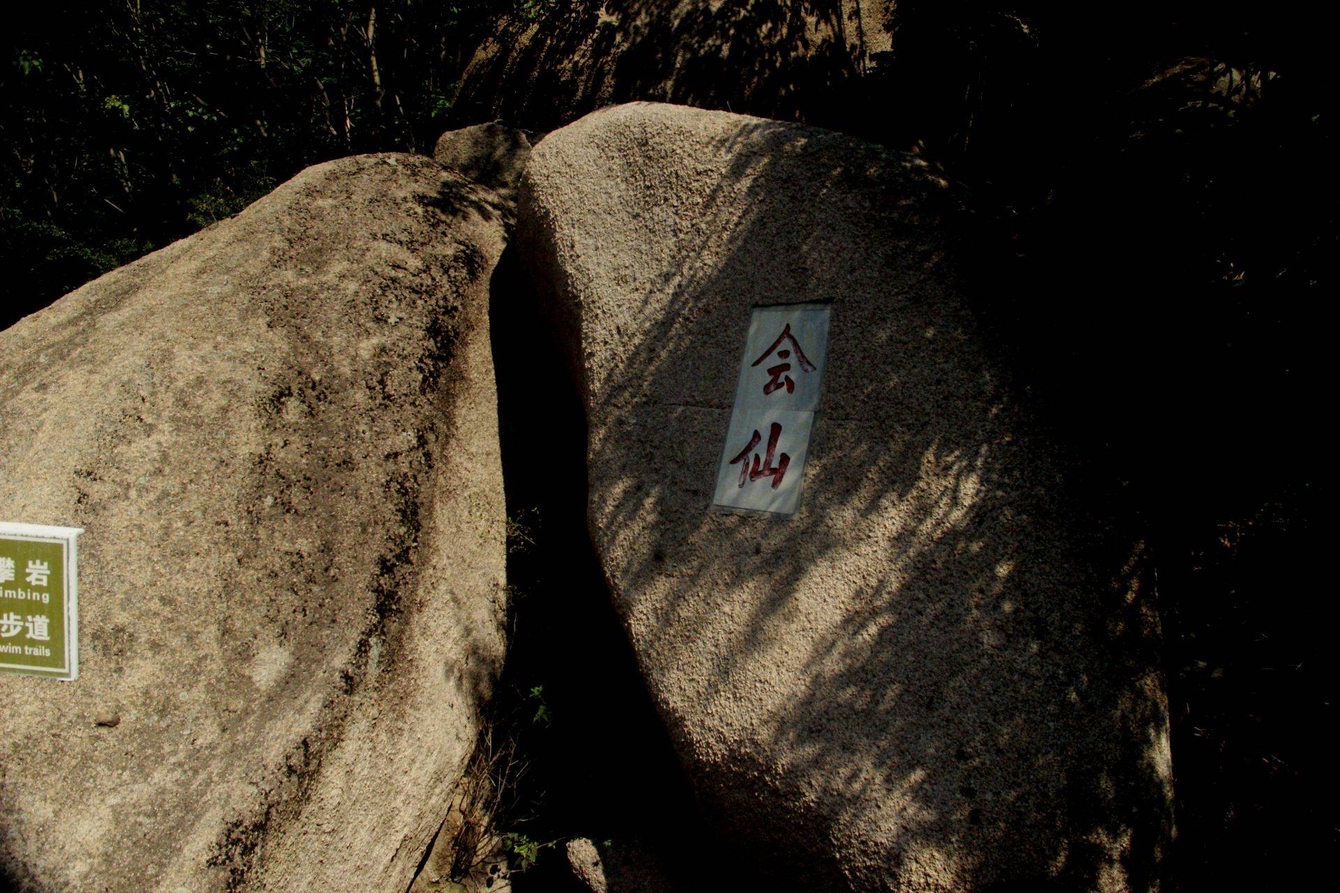 我们从“如意池”旁沿着铺就的石阶艰难北上,攀登北峰。沿途钻过步仙、慕仙、梦仙、会仙、度仙等层层“仙洞”,我们大汗淋漓,真的要度化成仙人了。在接近顶峰的地方,设计者在巨石上,设计了一对飞天翅膀,迎合了游客飞天成仙的梦想。游客争相拍照。