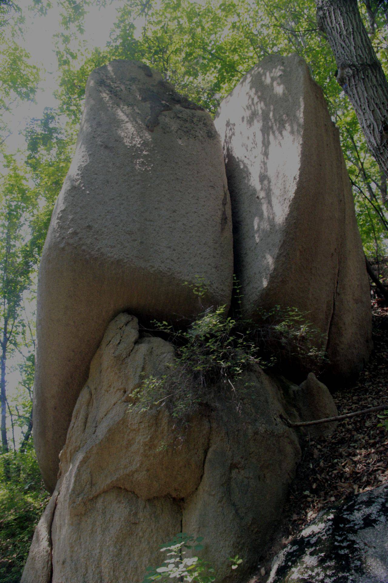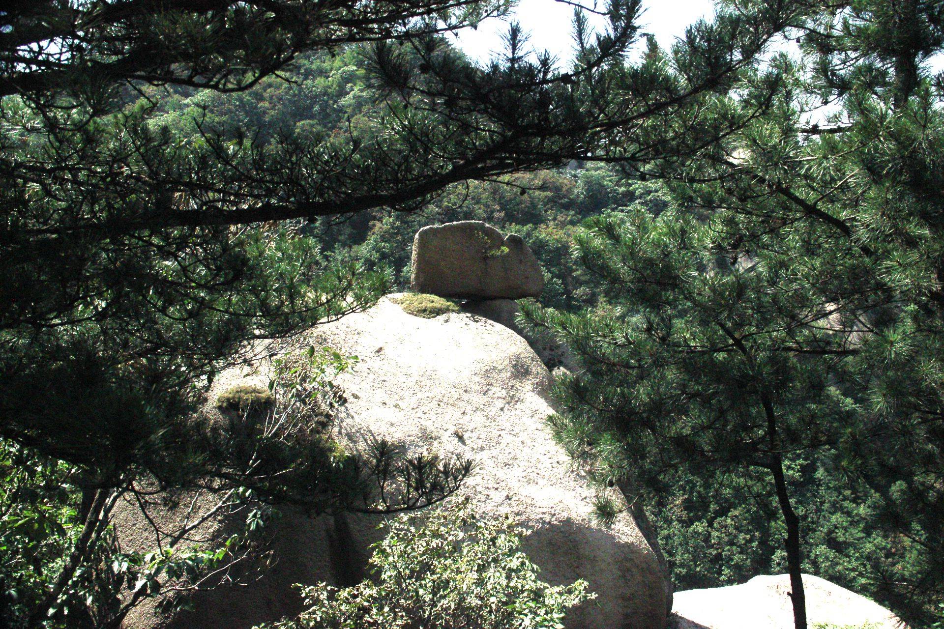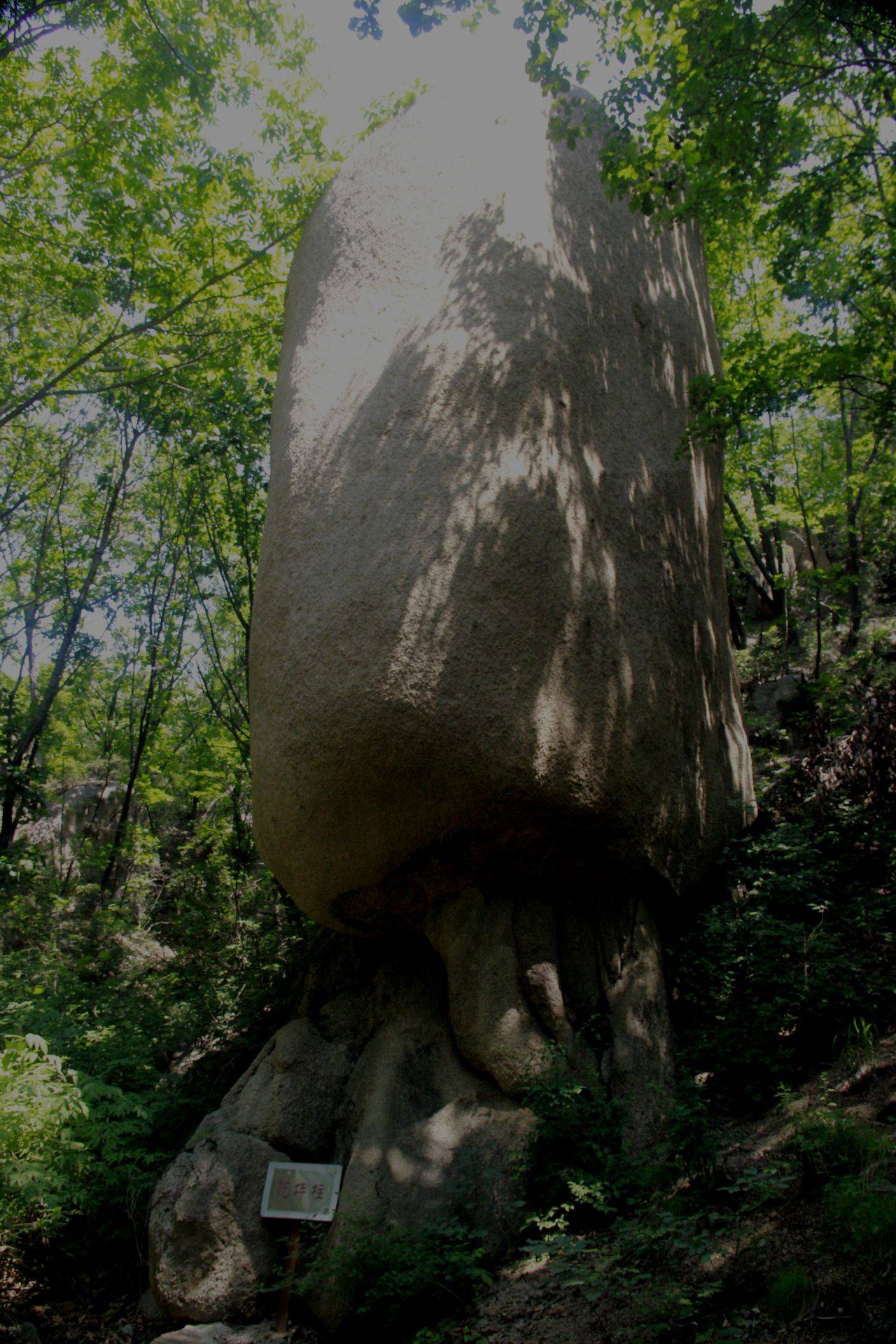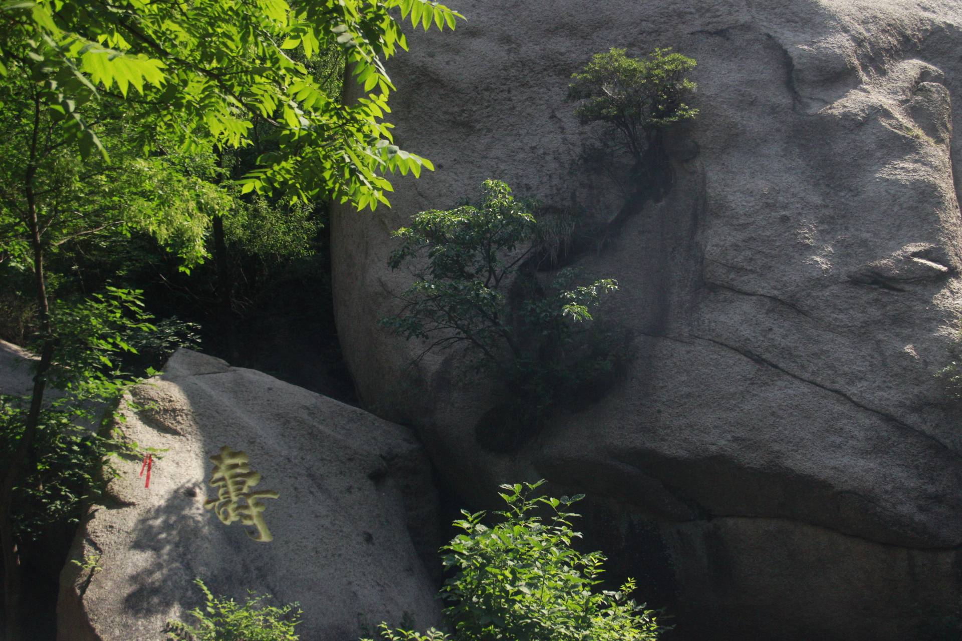 路旁这块巨石,从下边看,像一个巨大的虎头。从上方看,却是一颗大大的寿桃,故取名曰“三寿石”。