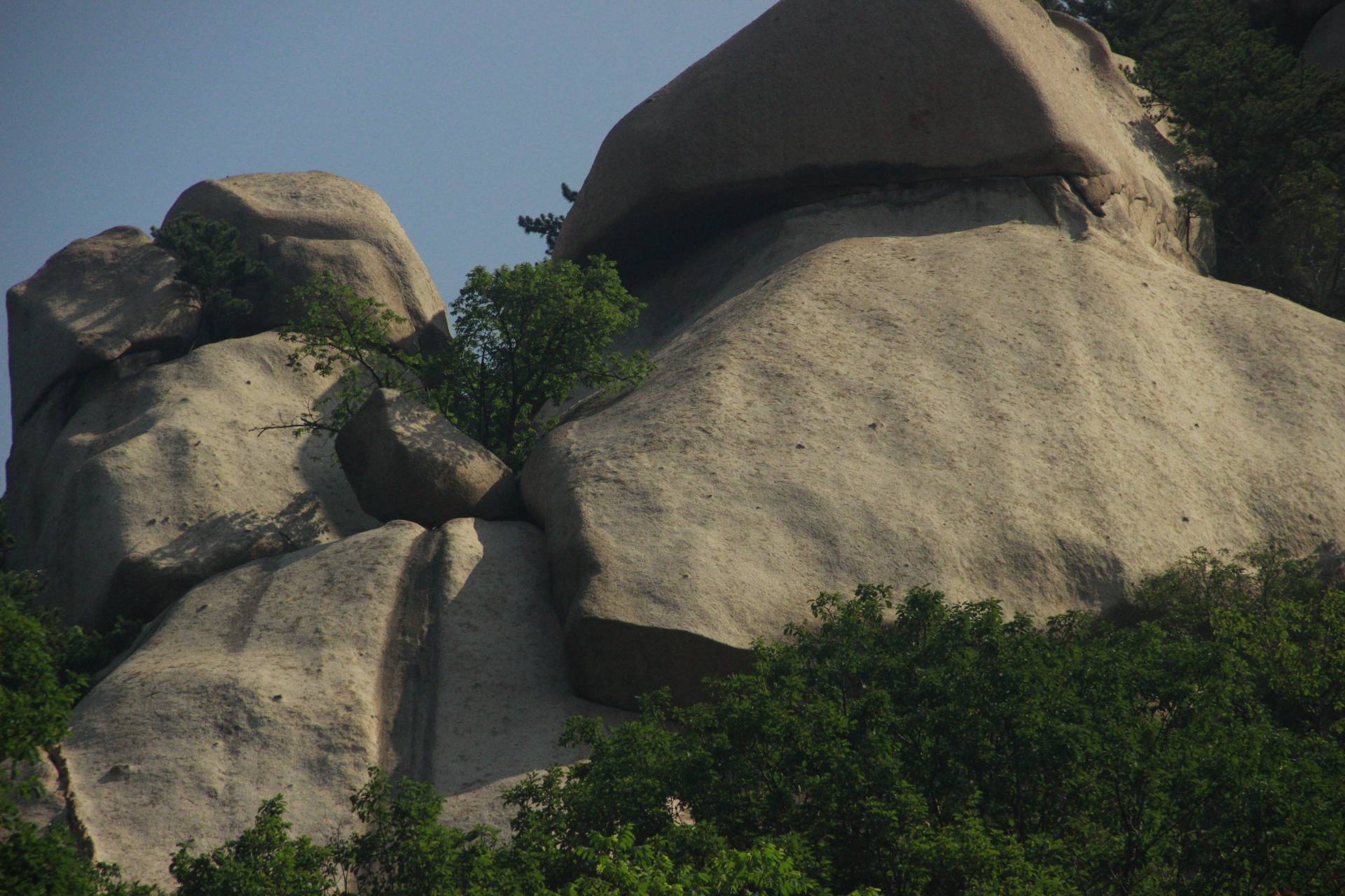 到了土路上,我们又近距离的观看了那个据说是从月宫里偷偷下凡的石兔,亿万年来卧在那里一动不动。惊奇的是它的身上长着一棵小松树。今年这么严重的干旱,它竟然没旱死,哪来的水分呐?它是在吸吮石兔的血液吗?
