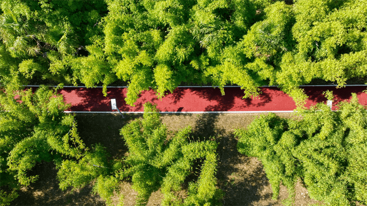 在观山湖区金阳北路一侧的绿化带中,有一条红褐色的步道如项链一般串起周边景致,中式古典文化园林景墙、休闲廊架、炫彩灯光墙等似五彩晶石点缀其间......人们在此锻炼、散步、观景,空气清新、环境清幽,令人怡然自得。