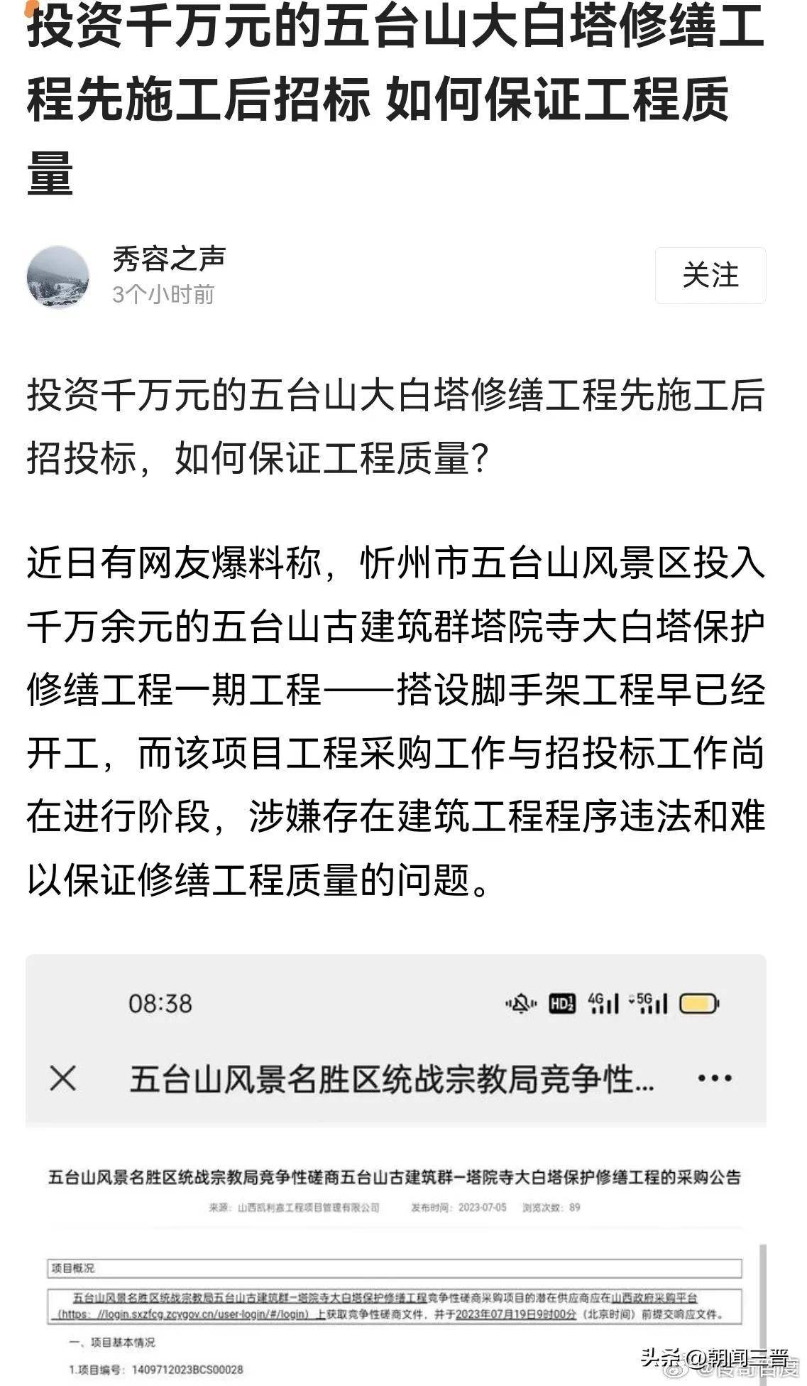近日有网友爆料称,忻州市五台山风景区投入千万余元的五台山古建筑群塔院寺大白塔保护修缮工程一期工程——搭设脚手架工程早已经开工,而该项目工程采购工作与招投标工作尚在进行阶段,涉嫌存在建筑工程程序违法和难以保证修缮工程质量的问题。