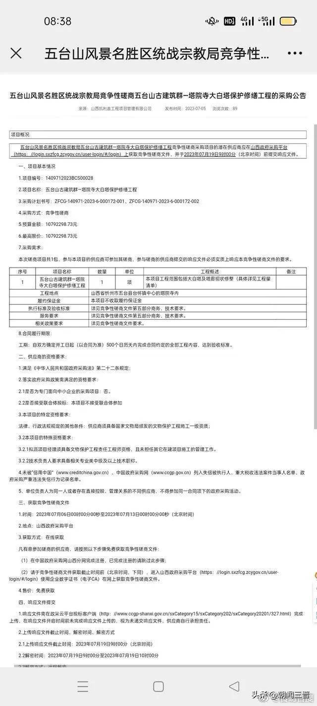 山西省公共资源交易信息服务平台2023年7月5日发布的信息显示,该修缮工程项目尚在竞争性磋商期和招投标公告阶段,采购人为五台山风景名胜区统战宗教局,采购代理机构为山西凯利嘉工程项目管理有限公司,工程预算和最高限价为10792298.73元。2023年7月6日至7月13日为获取竞争性磋商文件的时间。另外,按照山西省文物局关于五台山五台山古建筑群——塔院寺大白塔保护修缮工程设计方案的批复文件要求,要分期实施修缮项目,一期工程为搭设脚手架,二期为保护修缮施工期,三期为修缮后效果和各项维修监测维护期。