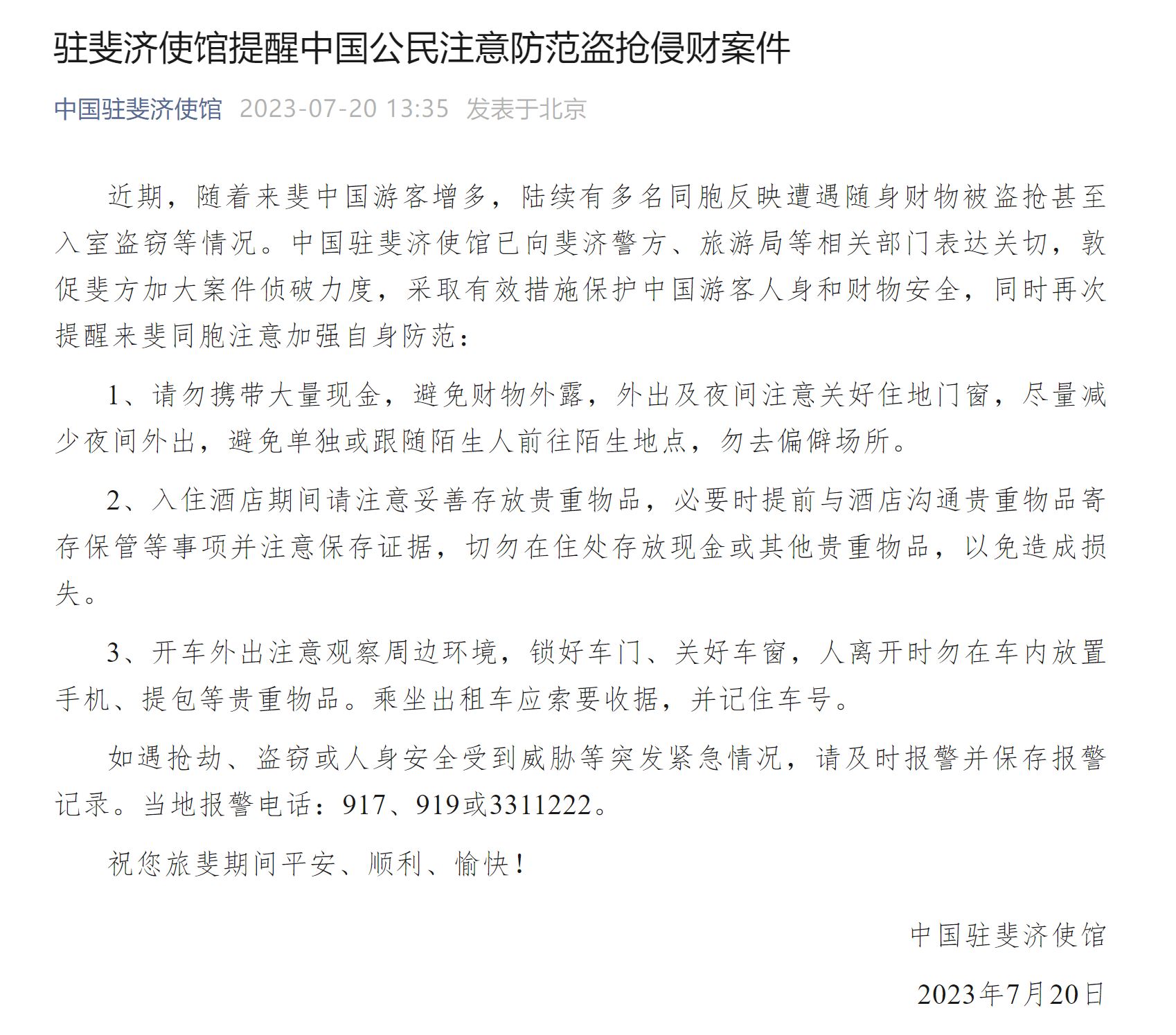 7月20日,据“中国驻斐济使馆”消息:近期,随着来斐中国游客增多,陆续有多名同胞反映遭遇随身财物被盗抢甚至入室盗窃等情况。中国驻斐济使馆已向斐济警方、旅游局等相关部门表达关切,敦促斐方加大案件侦破力度,采取有效措施保护中国游客人身和财物安全,同时再次提醒来斐同胞注意加强自身防范: