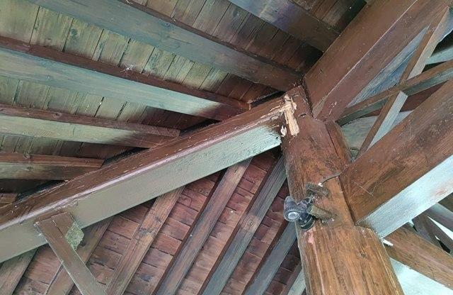 茅乡水情的芳桂亭是上香古道“网红”凉亭,常有游客市民坐在凉亭下欣赏风景、摄影休憩,享受茶余饭后的漫漫时光,是市民游客十分喜爱的打卡点,也是管理处此次检查的重点目标。经现场勘查发现,亭子的西南方向承力立柱和横梁均有被白蚁啃食过的痕迹。敲击棕黄色的柱体内部已经被严重蛀空,翻开表皮布满了密密麻麻的空穴,在仔细检查后发现其他立柱也有不同程度的蛀空,存在着一定安全隐患。