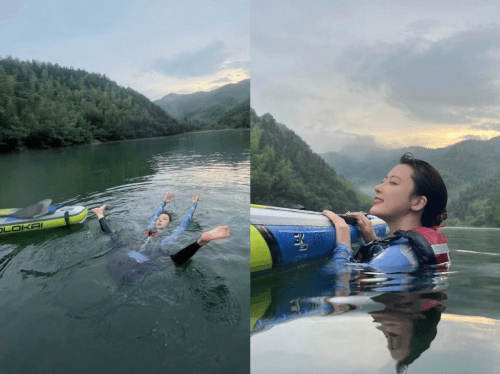第二次下水的时候就可以站起来划桨了,站起来划桨的体验感真的很棒,没有了紧绷感,在湖中在绿荫下觉得身体慢慢放松下来。那些被藏在心里不愿意被翻出来的情绪,它们自己跑出来了,它们跳进了湖里,藏进了大山里,飘到了云里。我就静静的躺在那里,什么都不去想。