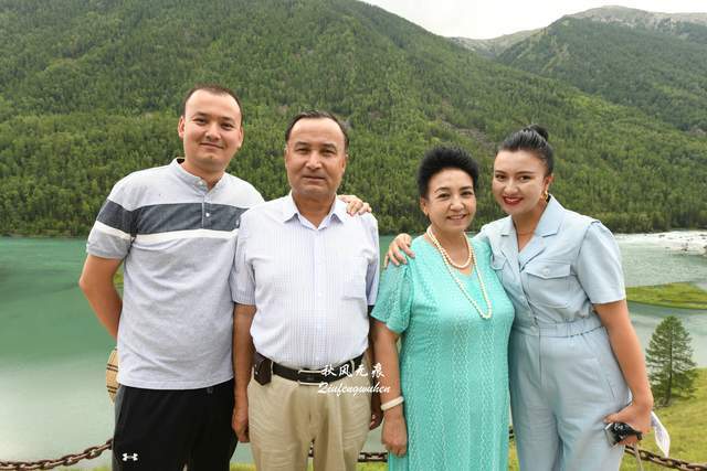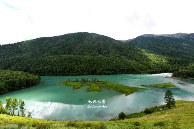 卧龙湾的湖水中间,一个龙的造型小岛站立水中央,仿佛远古的苍龙卧在在水湾,龙身上的草与树,就是卧龙在千万年间的沧桑印记。观景台遇到乌鲁木齐来的幸福一家人,他们邀请我记录下喀纳斯的幸福瞬间。