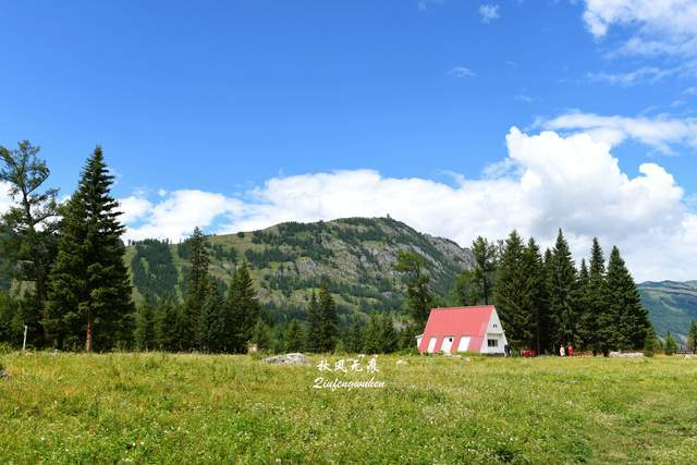 在贾登峪停车,换乘景区摆渡车直达核心景区,改乘去湖边的景区交通车,喀纳斯宽阔的湖面成为北疆明珠的初次走近。喀纳斯平静的湖水,没有“水怪”的身影,湖光山色里,有白桦林美丽的身影。返回换乘点的路上,草地上的红顶小屋,在绿色草地与青山之间,流淌出北疆风景的韵味。