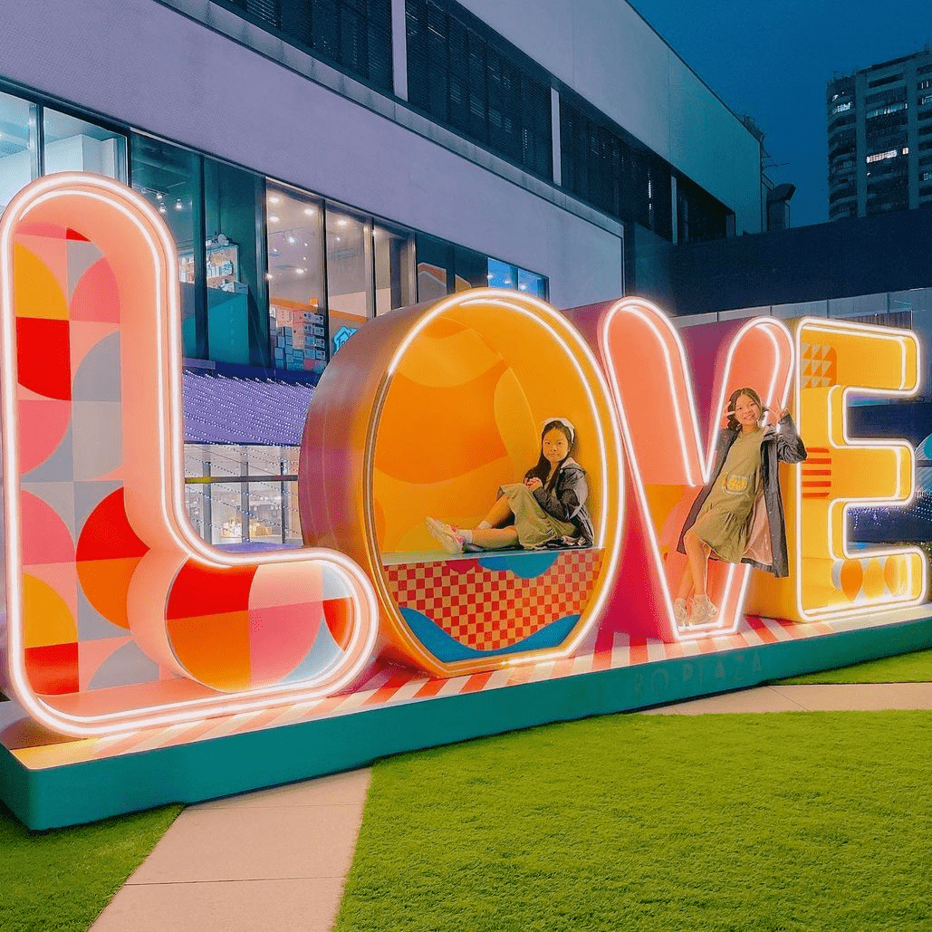 「LOVE」艺术装置也特意掏空中间,让大家可以融入进去拍照。而且建议是晚上来,灯亮起来更出效果~