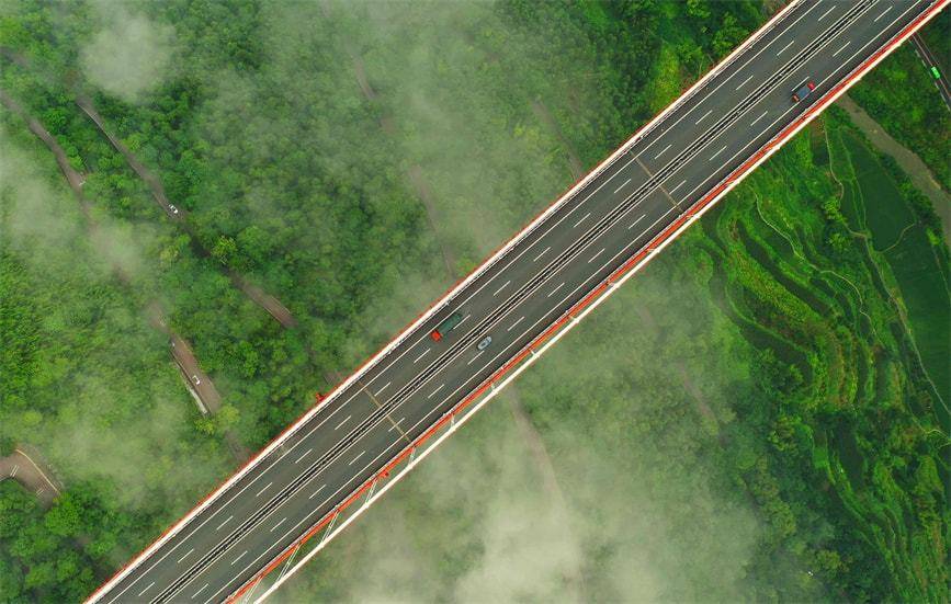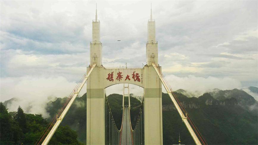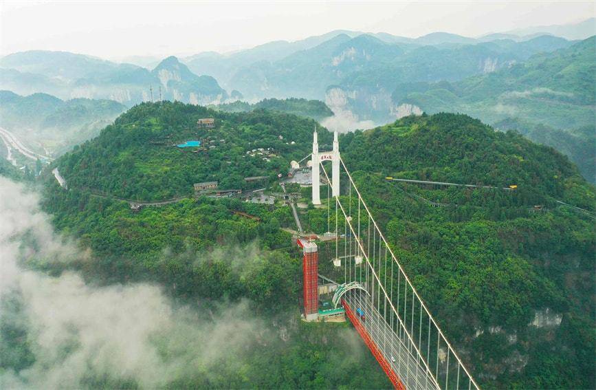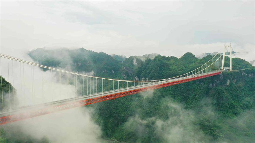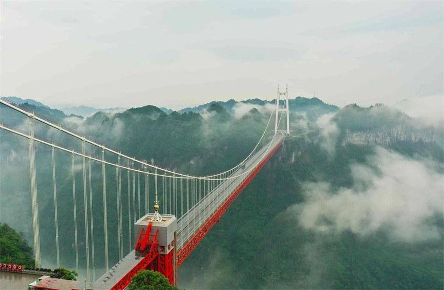 近日,湖南省湘西土家族苗族自治州吉首市矮寨镇矮寨大桥在云海间若隐若现,景美如画。(刘贵雄、陈祉凝)