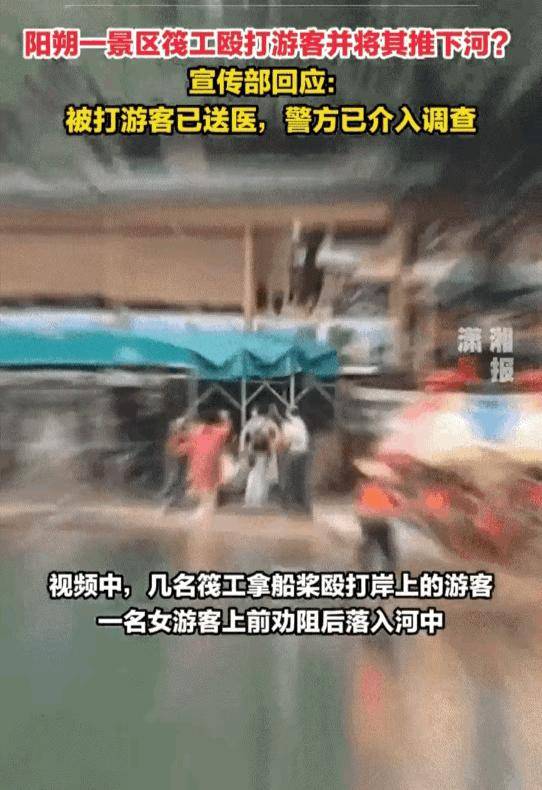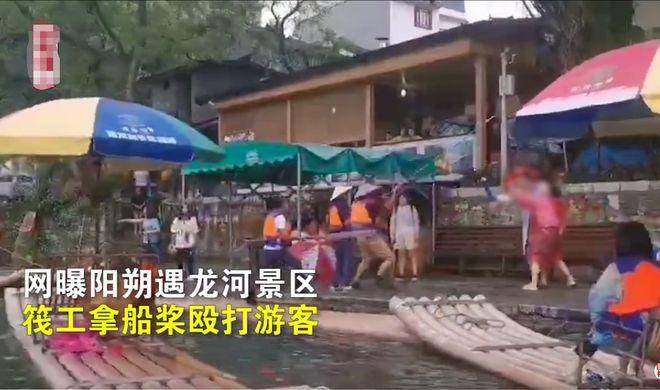 其中一名筏工手持船桨多次打在男游客身上。