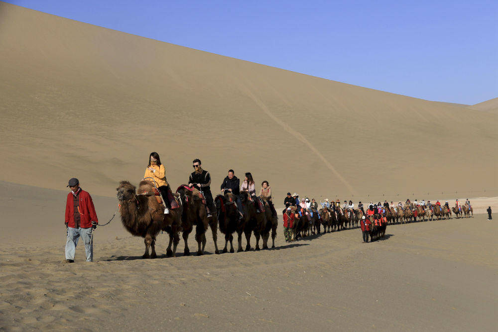 ↑游客骑着骆驼在鸣沙山月牙泉景区游览。图据新华社