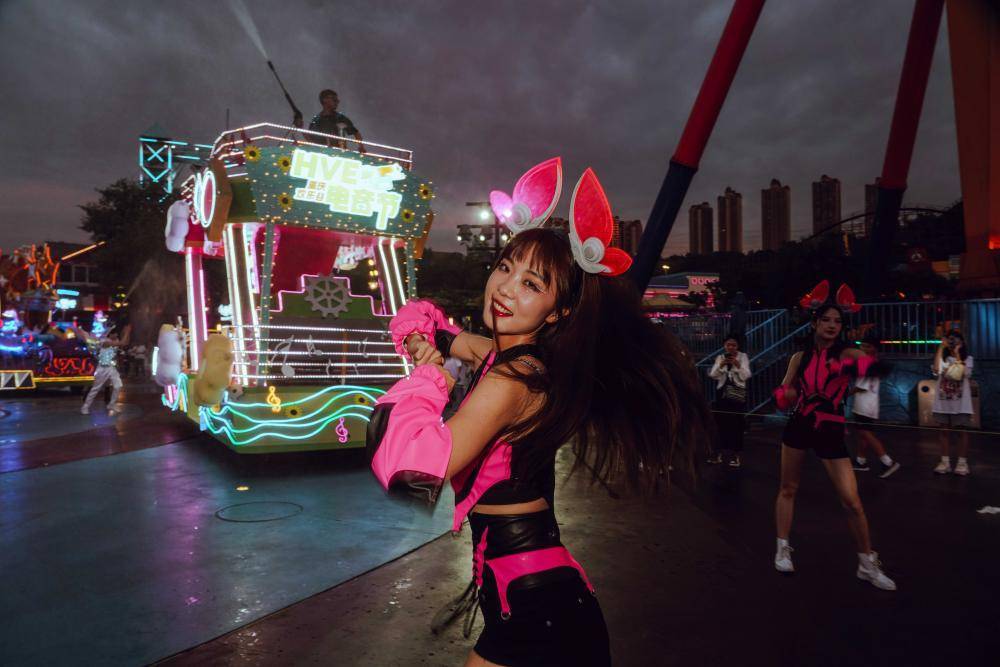 进入夏季以来,气温持续走高,游客会专门选择夜间游玩,欢乐谷因此每日都开放夜场。加上暑期周六的晚上也是重庆欢乐谷HVE电音节固定举办的日子,使得周末的工作更加繁忙,更要保持好状态。作为西南地区最大的泼水电音节,马思唯、隔壁老樊、夏日入侵企画、棱镜、海龟先生等歌手与音乐组合将轮番登台,整个电音派对将持续58天。当天一开园,舞台前便早早挤满了等待的观众。花车巡游开始前,程玉颖和巡游队伍要穿上精美的服装,不断调整自己的状态以达到最佳,并和花车一起,伴着动感的音乐,出现在游客的视野里,从游客之间穿过,舞蹈,互动,在电音节正式开始前,把现场观众的情绪调动到最佳。