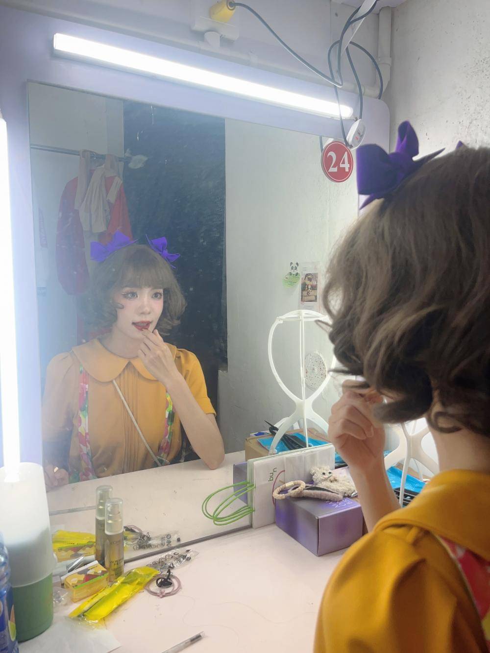 首先是化妆。为了保证每场演出的效果,演员们都有妆容的要求,也必须要贴假睫毛,之后是在化妆间的各种准备,11点开园时,演出就开始了。园区里有不同的主题区和表演区,在白天的时间里,程玉颖和演员们要穿梭在各个区和舞台之间,为游客们送上表演。
