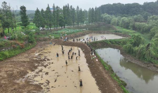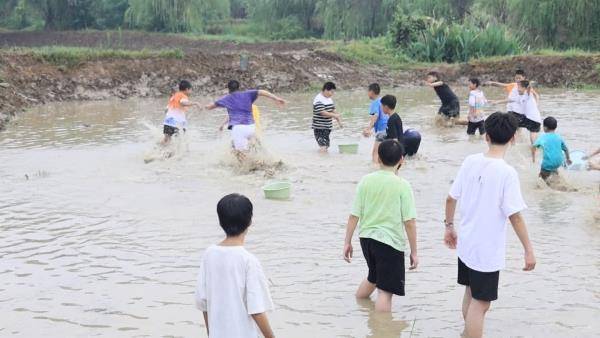 在蔡市镇潇湘文化园农耕文化体验区,一群孩子们光着脚丫在泥田里徒手摸鱼、捉鸭子,或单打独斗,或团队作战,大家尽情玩耍,感受传统农耕文化及田园乐趣。