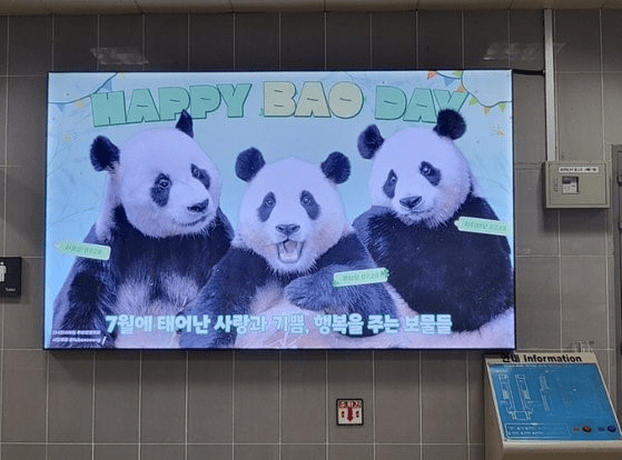 据韩国《中央日报》7月19日报道,7月14日,爱宝乐园熊猫饲养员姜哲元来到了龙仁轻轨前垈·爱宝乐园站,观看站内2号出口方向的爱宝家族生日电子屏。电子屏上写着“Happy Bao Day”的字样,还有乐宝、爱宝、福宝等熊猫家族的滑稽形象。该电子屏广告于本月11日开始投放直至下月11日。
