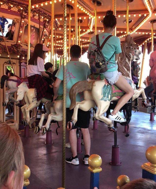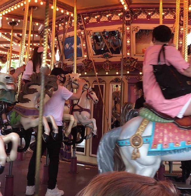 baby为了防晒带了遮阳帽,还是双层的哦,一层是粉色,一层是黑色,这样遮阳效果一定杠杠的,还有遮阳伞,防晒措施好到位,baby抱着小海绵坐旋转木马,黄晓明在一旁守护,特别温馨。对面一个穿黑衣服的女生,看着baby,大概觉得baby太美了吧。