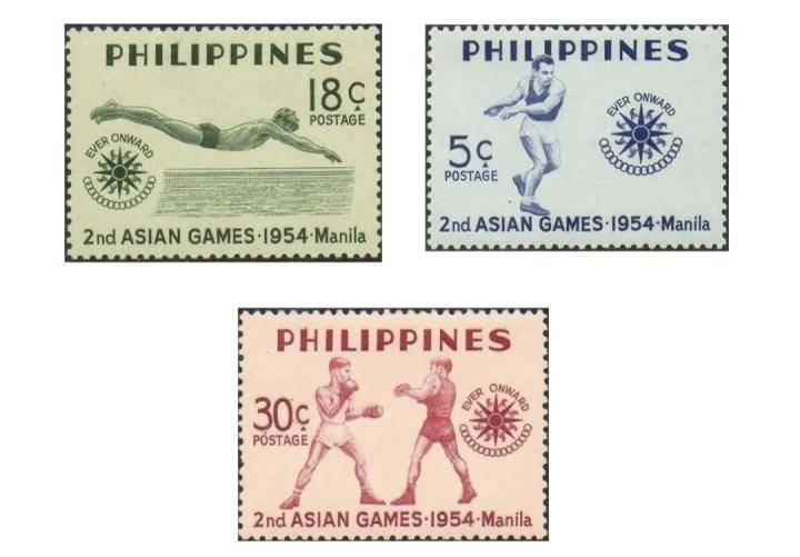 1954年的马尼拉亚运会,视角系统的设计还相对有限,会徽沿用了新德里首届亚运会的风格,吉祥物尚未提上日程。但马尼拉亚运会已经有自己的专属邮票与明信片,邮票有5分(Centavo)、18分和30分三种币值的款式,一一对应铁饼、游泳、拳击三个不同运动项目和湖蓝、浅绿、粉红三种底色。三枚邮票同时被设计进明信片的右上方;明信片左侧图案的设计相对复杂,高扬和密集排列的旗帜、跳水运动员以及建筑背景,有限的空间承载了充盈的信息。明信片的中下方伫立着一名男运动员,他的右手将火炬高高举起。