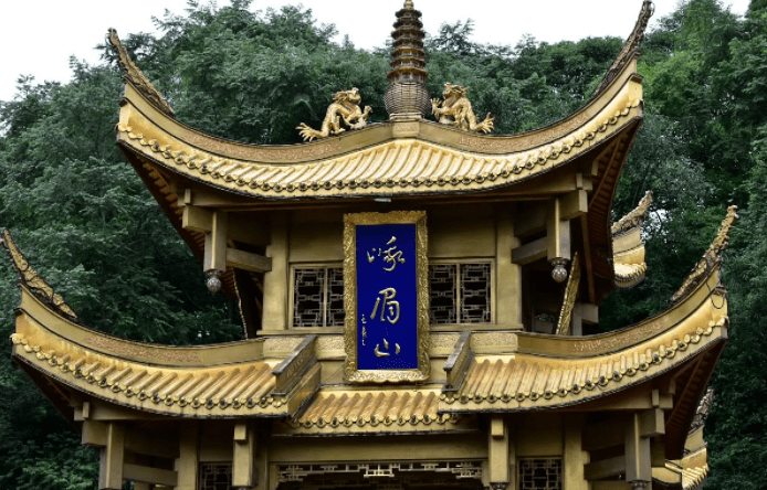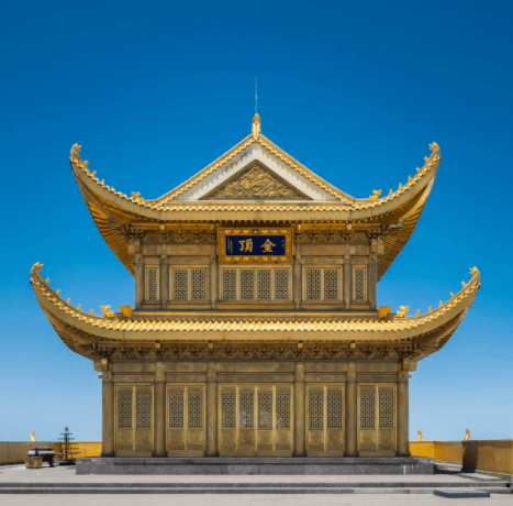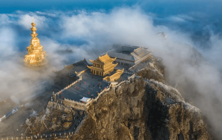 峨眉山金顶数次遭到破坏,现在的金顶是上世纪80年代后陆续开始重建的,金顶上高48米(代表阿弥陀佛的48个愿望)的十方普贤圣像,总重量到达600多吨,由台座和十方普贤圣像组成,是世界上最高的金佛,也是峨眉金顶的中心。圣像在阳光普照下,法相庄严,熠熠生辉,如佛光普照般震撼。