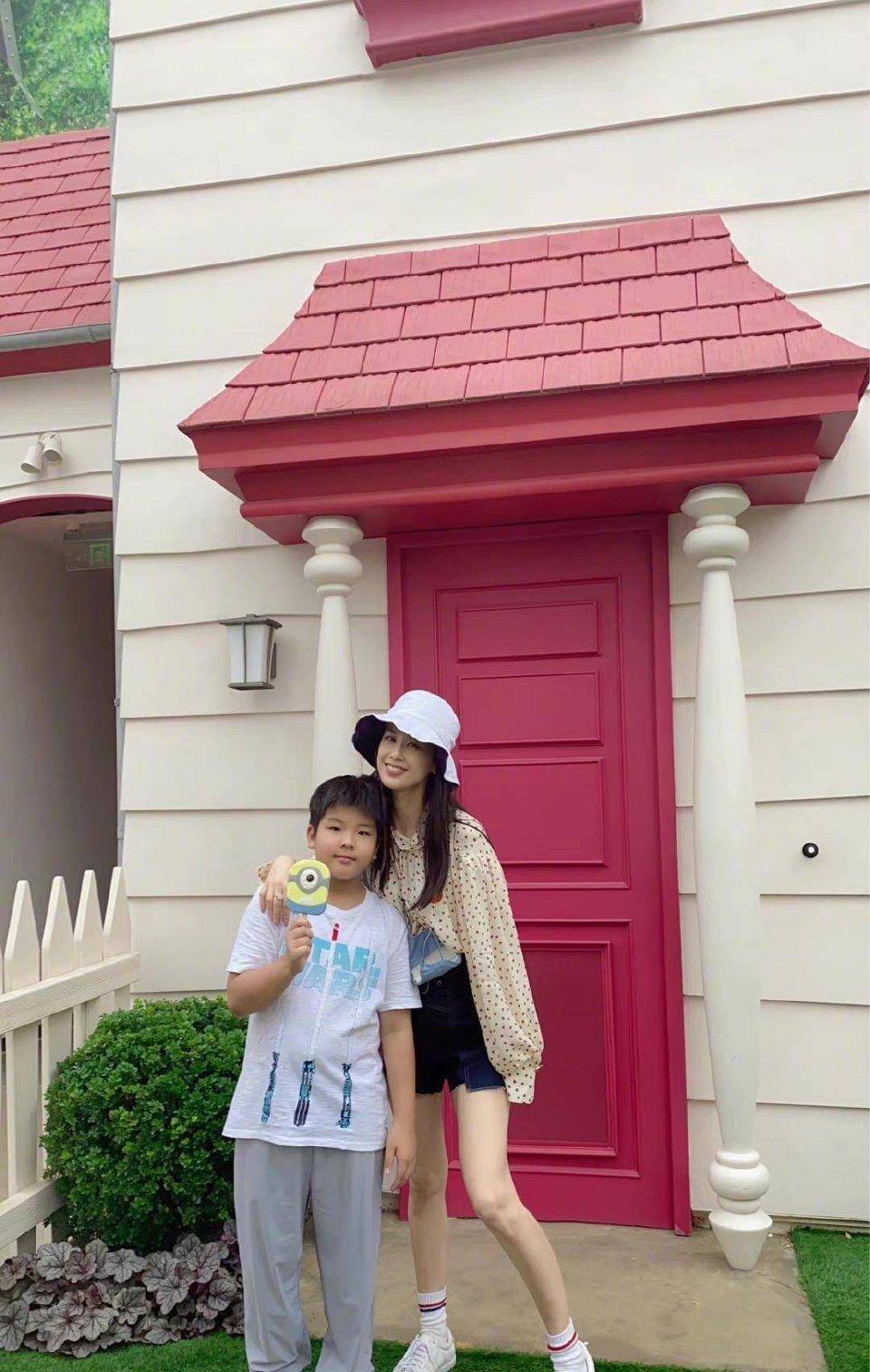 这张照片中黄圣依身穿一件米白衬衫,戴着一顶宽檐鸭舌帽,看起来轻松愉快。夹克外衣上的红色爱意波点裙和牛仔半身裙却很显年轻,加上一双大长腿青春年少气十足,和9岁的孩子安迪合照彻底像一对兄妹。
